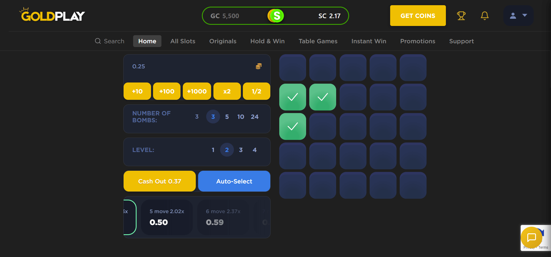 - 3 Gold Play Originals (instant win crash and prediction games)