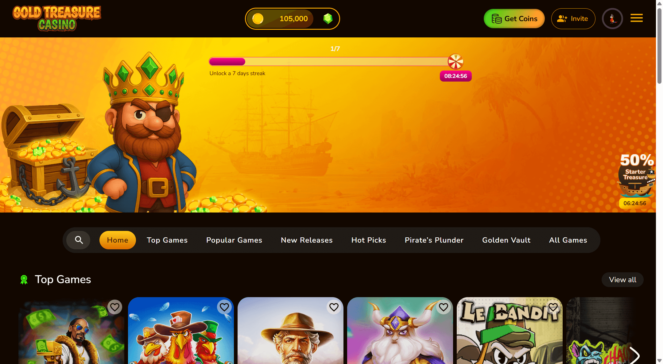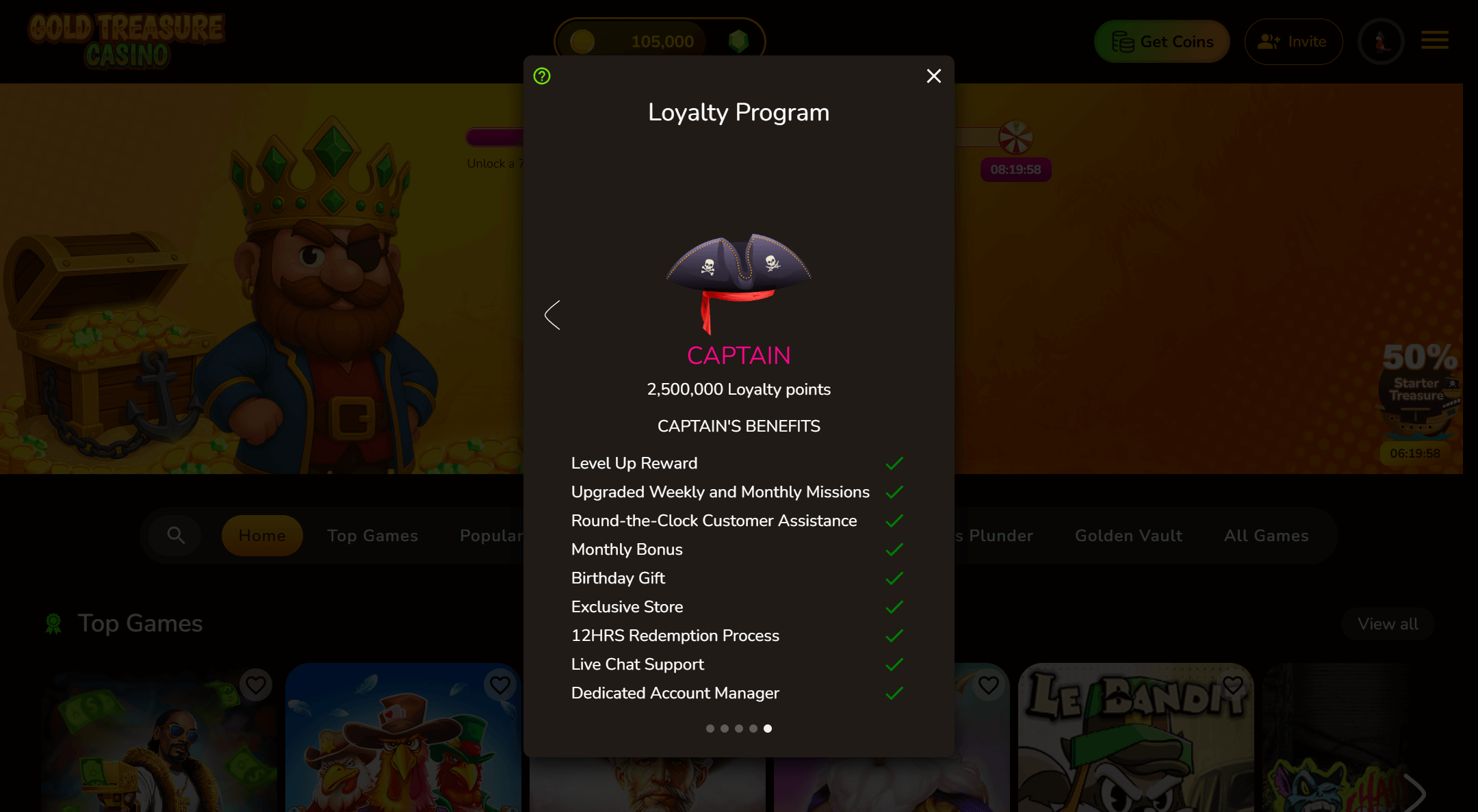 Gold Treasure uses a 5-tier Loyalty SystemâParrot, Pirate, Navigator, Quartermaster, and Captainârewarding SC/GC play and purchases. Climb ranks to unlock instant support, monthly/weekly mission perks, birthday gifts, 12-hour redemption, and a dedicated account manager at Captain. I moved to Pirate within a week, earning reloads and bonus spins.Â