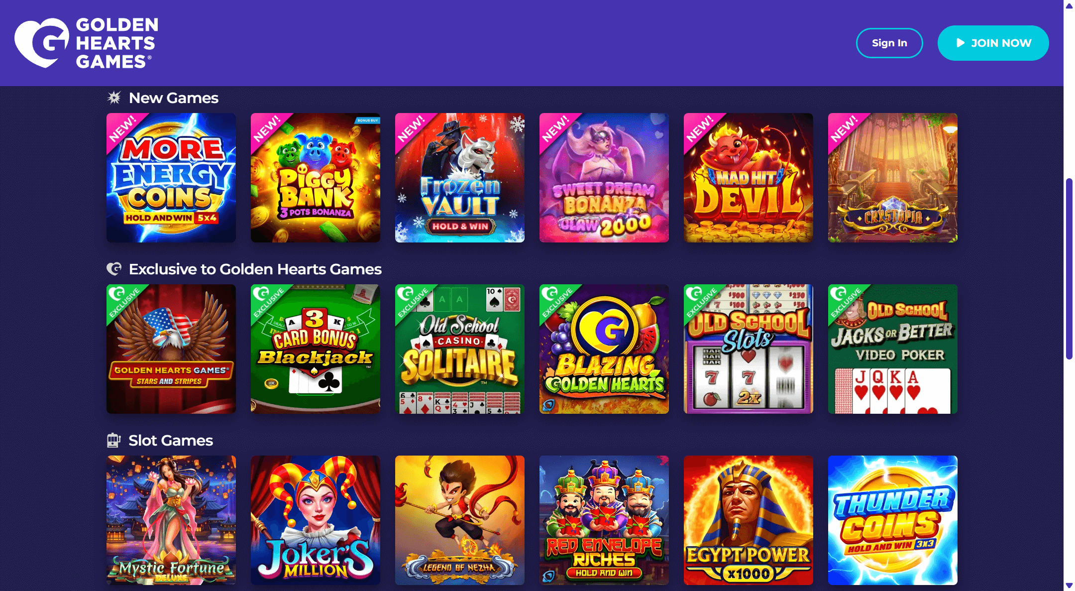 The Golden Hearts Games lobby feels compact, focused, and a little nostalgic, which worked surprisingly well for me once I accepted that this is not a slots madness style warehouse of 1000 plus titles. Most reviewers place the current total at roughly 100 games spanning bingo, classic slots, instant wins, and a few simple table games, with new titles trickling in rather than dropping in massive batches.