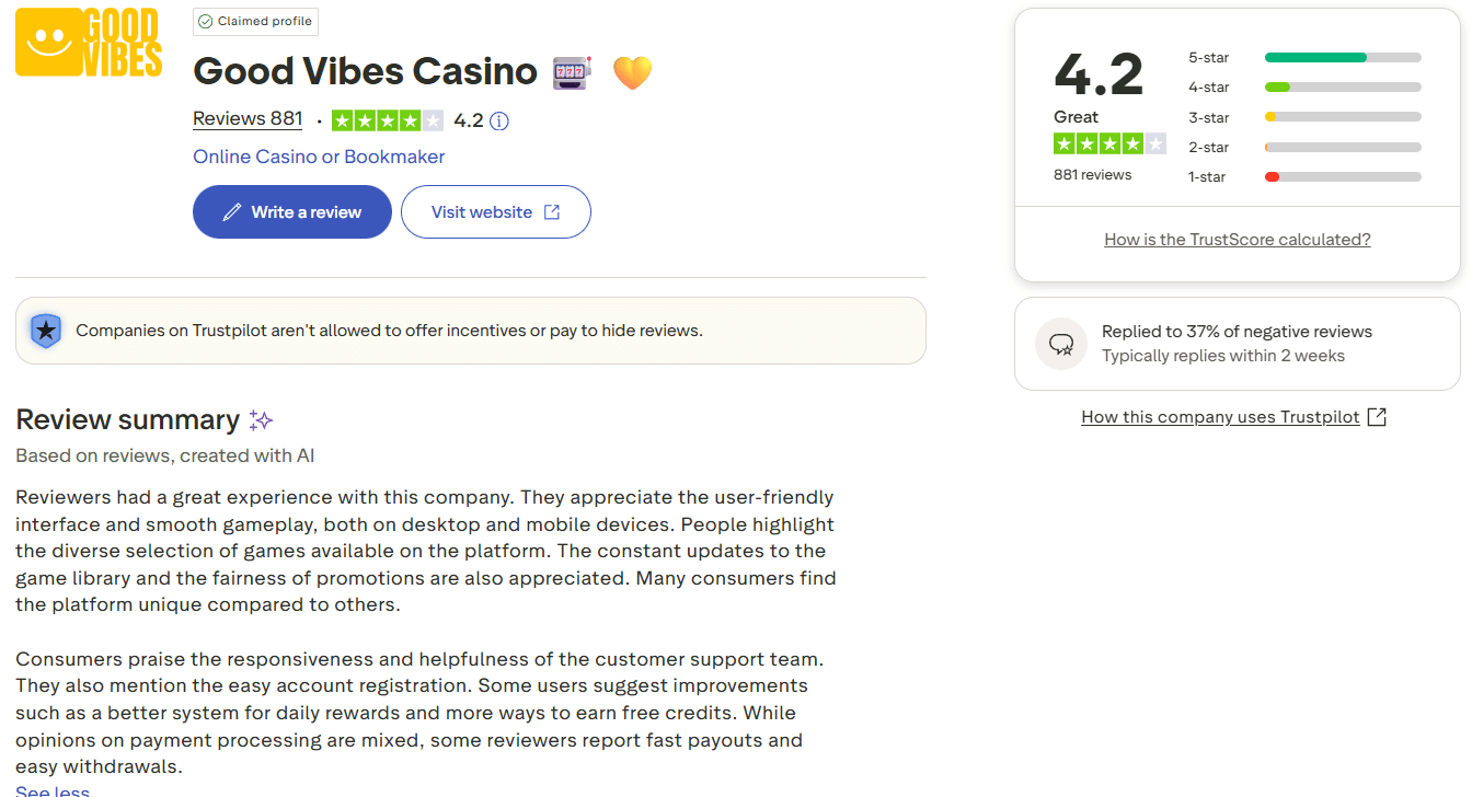 Trustpilotās headline score for Good Vibes looks strong at first glance, but digging into the individual comments paints a more mixed picture. Many of the short, fiveāstar reviews read generic or repetitive, which raises questions about how organic all of the praise really is, especially compared with the level of detail you normally see from genuine longāterm players. At the same time, there is a noticeable cluster of oneāstar reviews calling the site a scam, with recurring complaints about missing bonuses, blocked accounts, and Sweeps Coin redemptions being delayed or refused after substantial wins, so it is important to treat the overall rating cautiously and focus on the specific issues people describe rather than the average score alone.Ā