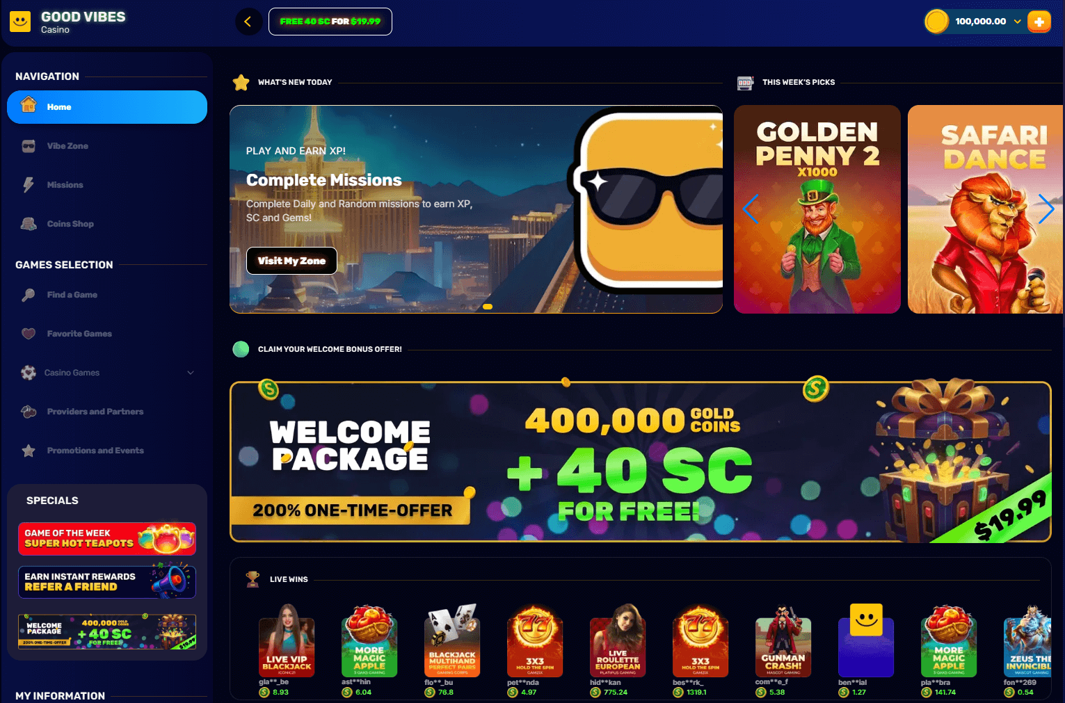 Good Vibes performs well in mobile browsers, mirroring the desktop layout with a responsive sidebar and large game tiles that are easy to tap on smaller screens. Purchases, missions, and redemptions all run through the mobile site, and even live tables remained stable during testing, though a dedicated native app is not prominently advertised.