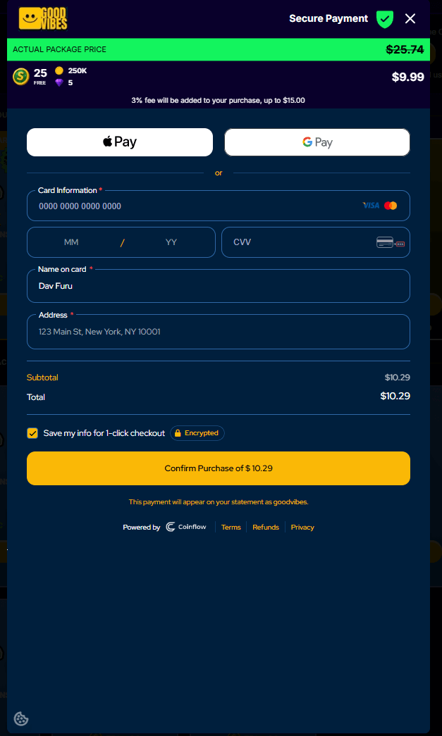 - Purchasing methods: Major cards plus Apple Pay and Google Pay via Coinflow.