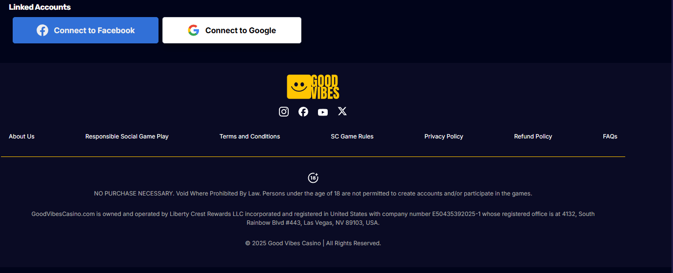 GoodVibesCasino.com is owned and operated by Liberty Crest Revels LLC. The terms specify that games are void where prohibited and that Sweeps Coins function as entries into sweepstakes drawings, with prizes subject to eligibility and verification.