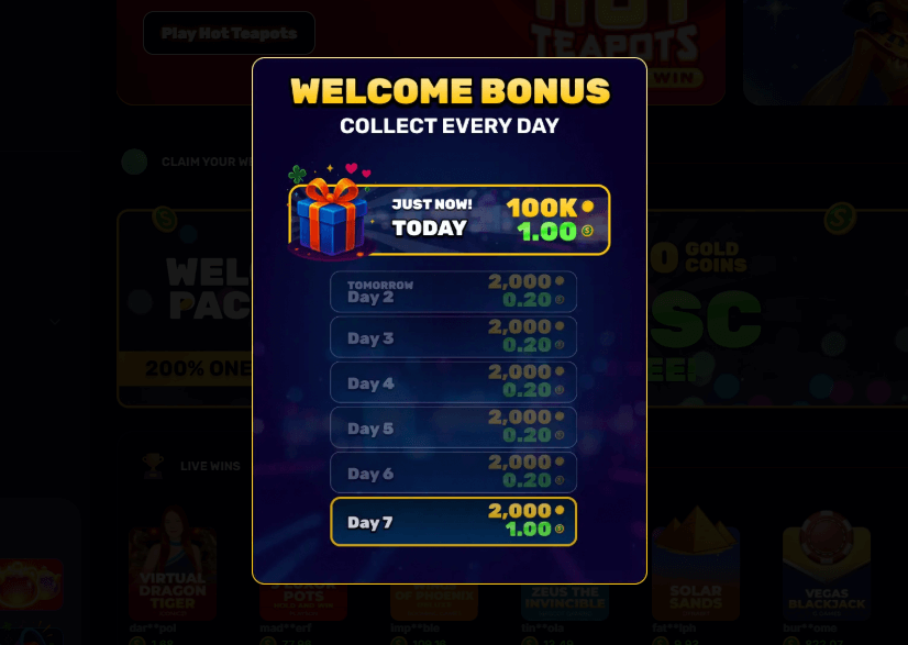 The headline offer is a 100,000 Gold Coin + 1 Sweeps Coin no-deposit bonus credited during your first day, which is enough to test several slots and a few Sweeps spins without funding your account. The main welcome bundle then jumps to around 400,000 Gold Coins + 40 Sweeps Coins, with alternative starter packs like 250,000 Gold Coins + 25 Sweeps Coins at roughly $9.99, often flagged as ābest valueā options.