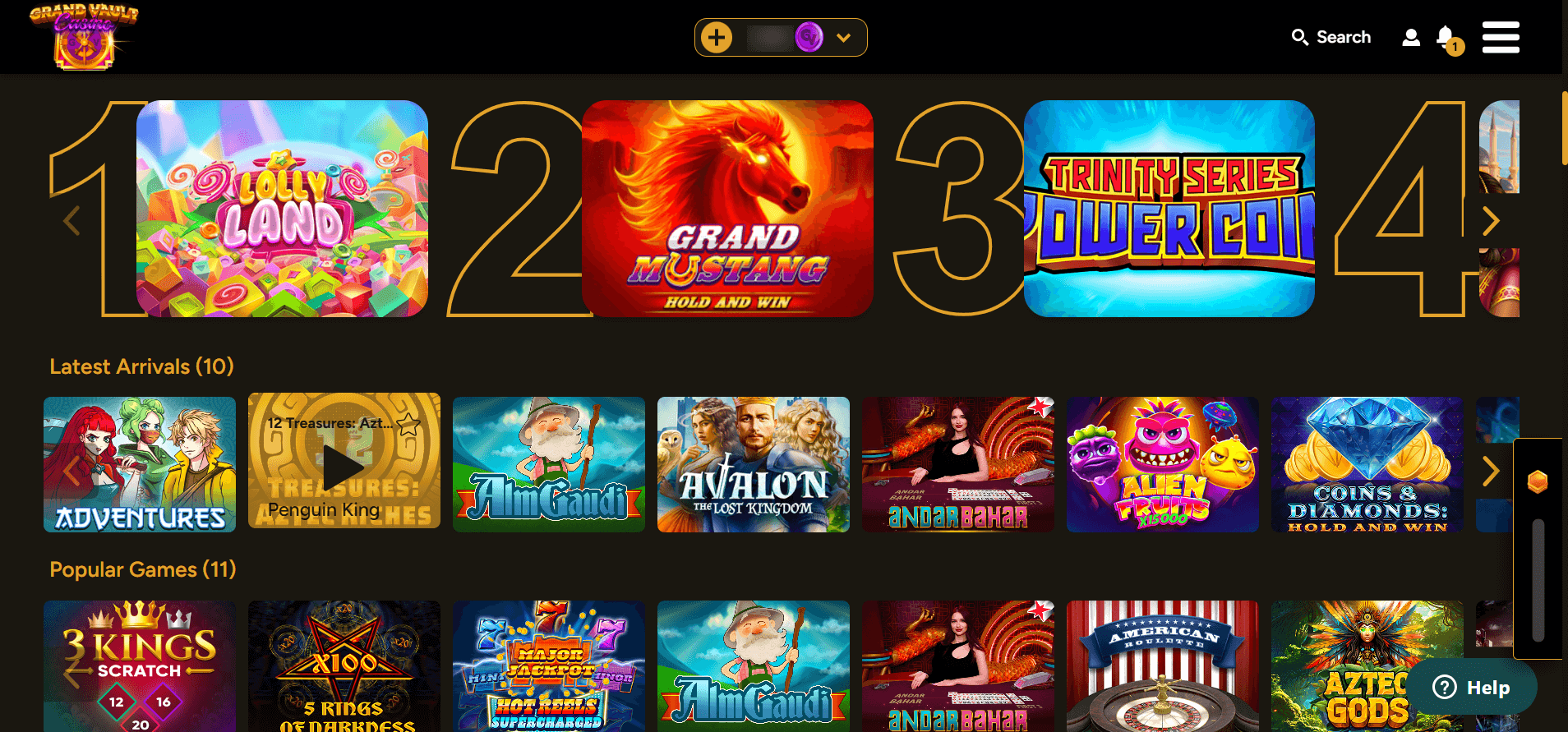 Grand Vault Casinoâs bonus structure is bold for a new sweeps platform, but it doesnât fully match big names yet. I started with a 2.5 GrandVault Coin (SC equivalent) no-deposit bonus and 50,000 Gold Coins immediately in my account. Daily login bonuses are live, scaling up into the VIP range, and a âFoundersâ Boosterâ for the first 5,000 users promises a 50% SC bonus on first GC purchases. All bonus coins and promos must be played at least once before redemption, and most apply âmainly to BGaming slotsâ (but I tested, and youâre not locked out of the full lobby).