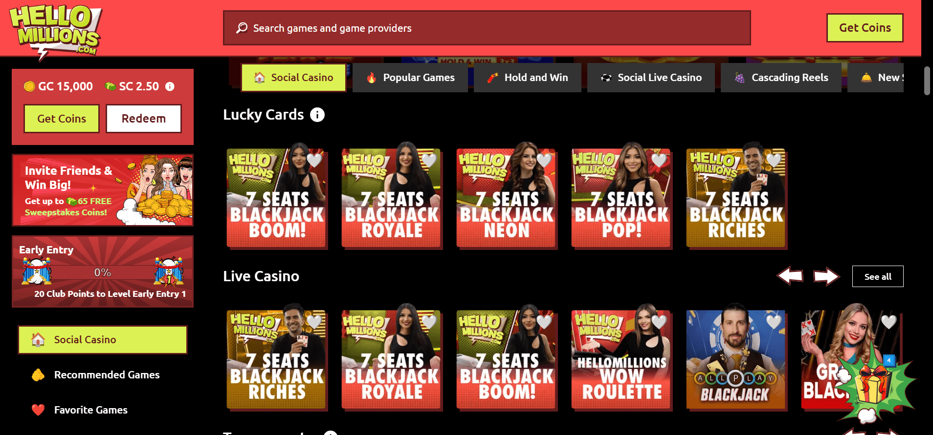Referral contests, two weekly social media prize drops, and daily leaderboard slot races give Hello Millions a growing loyalist vibe. SC/GC codes are unlocked with each major update, and refer-a-friend perks (up to 65 SC per active invite) are easy to trigger. Mail-in entries, challenge missions, and Discord integration are âcoming soon.â