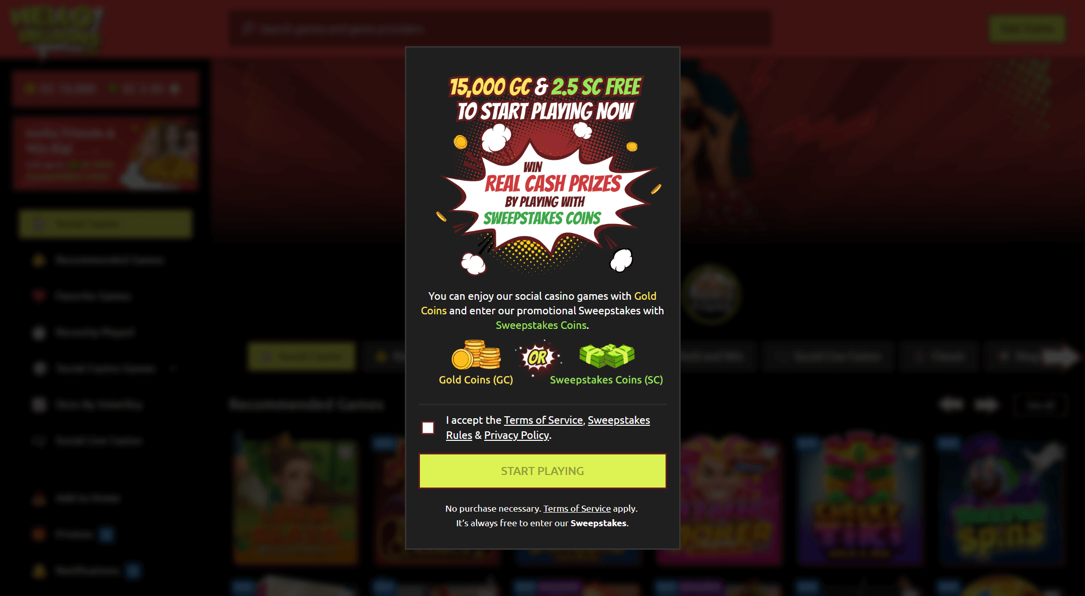 The sign-up bonus is instant: 15,000 Gold Coins + 2.5 Sweeps Coins simply for registeringâno code needed, just jump in. New users can land a 245,000 GC + 117.5 SC bundle with a purchase or pick rapid-fire offers like â50K GC + 25 SC for $9.99â using promo codes. Recurring rewards include 1,500 GC + 0.2 SC daily, weekly jackpot races (up to 2 million GC and 1,000 SC), refer-a-friend, and lively mail-in and social media bonuses. SC have a 1x playthrough for cash/redemption.