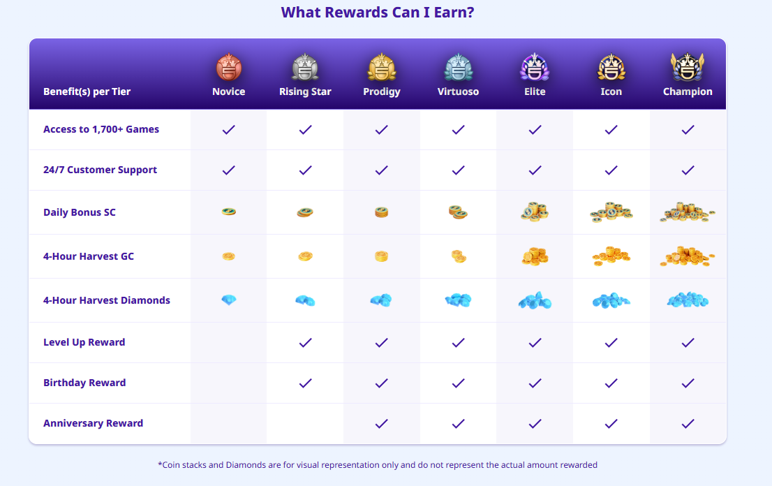 As you play games on the platform (using either Game Coins or Sweeps Coins), you automatically earn progress toward the next tier. The higher your tier, the more valuable your rewards become.