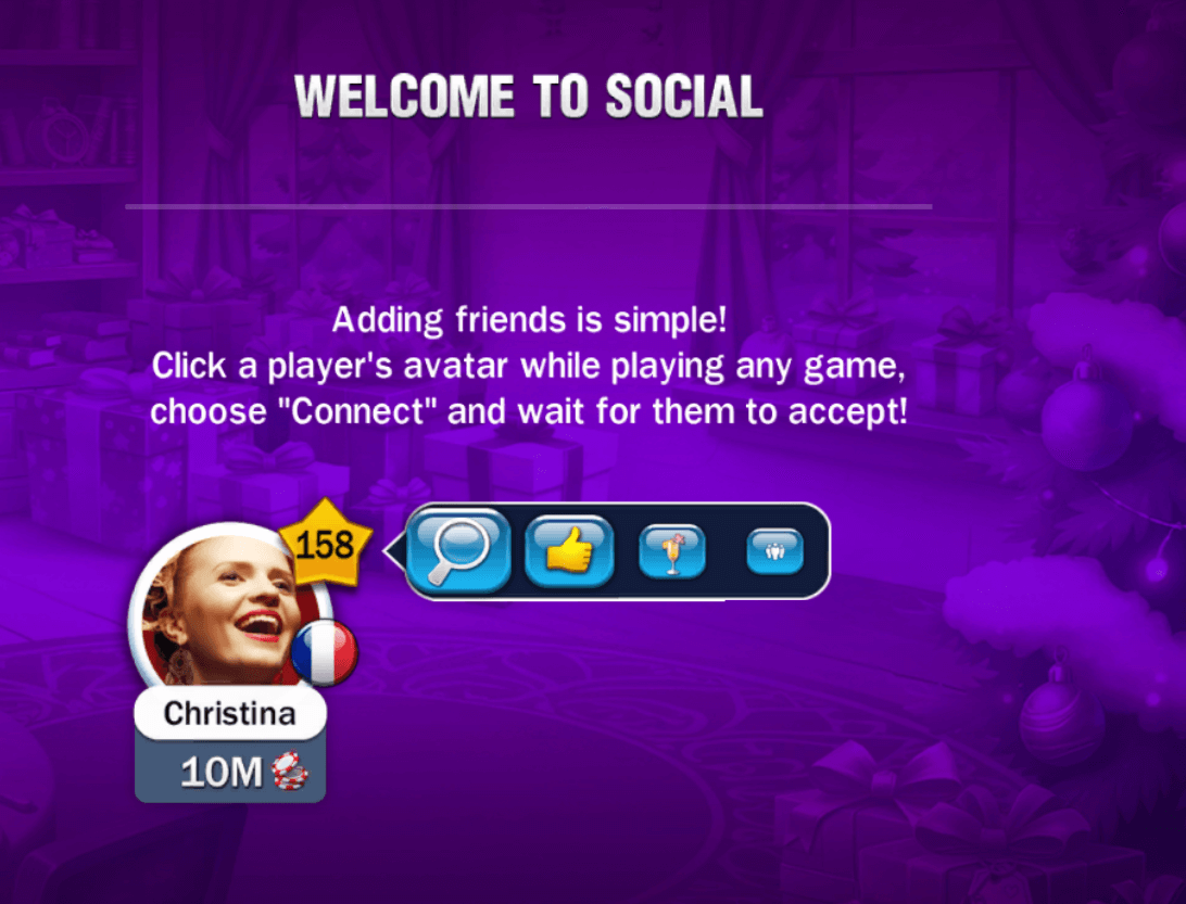 Huuuge emphasizes friend connections via Facebook integration, showing levels and names after acceptance, plus clubs and leaderboards for social competition. No Discord or Telegram; social media stays basic with promo codes occasionally posted.