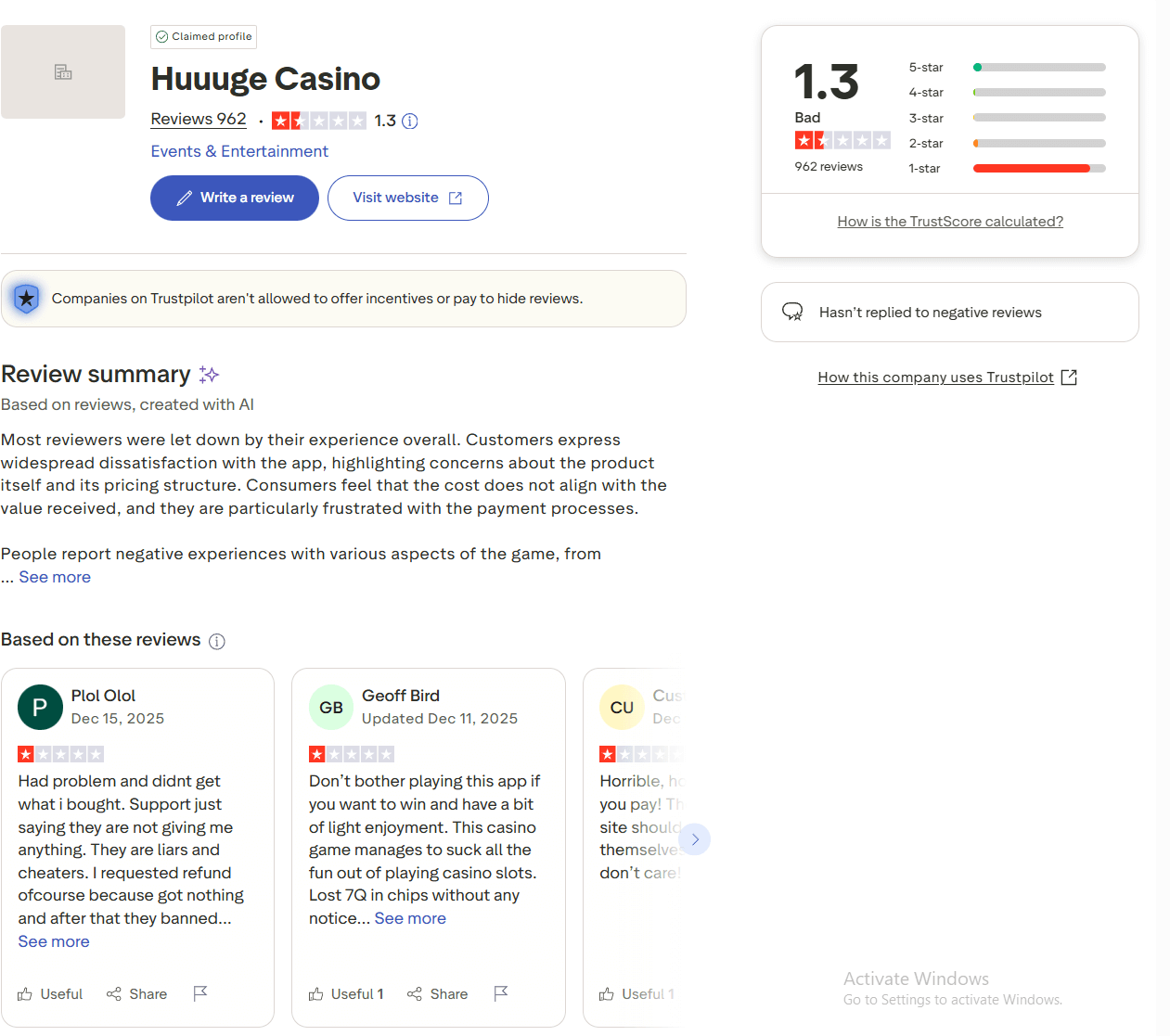 Trustpilot scores a dismal 1.3/5 from 962 reviews, dominated by 1-star complaints on rigged gameplay, lost progress, and predatory chip scarcity.