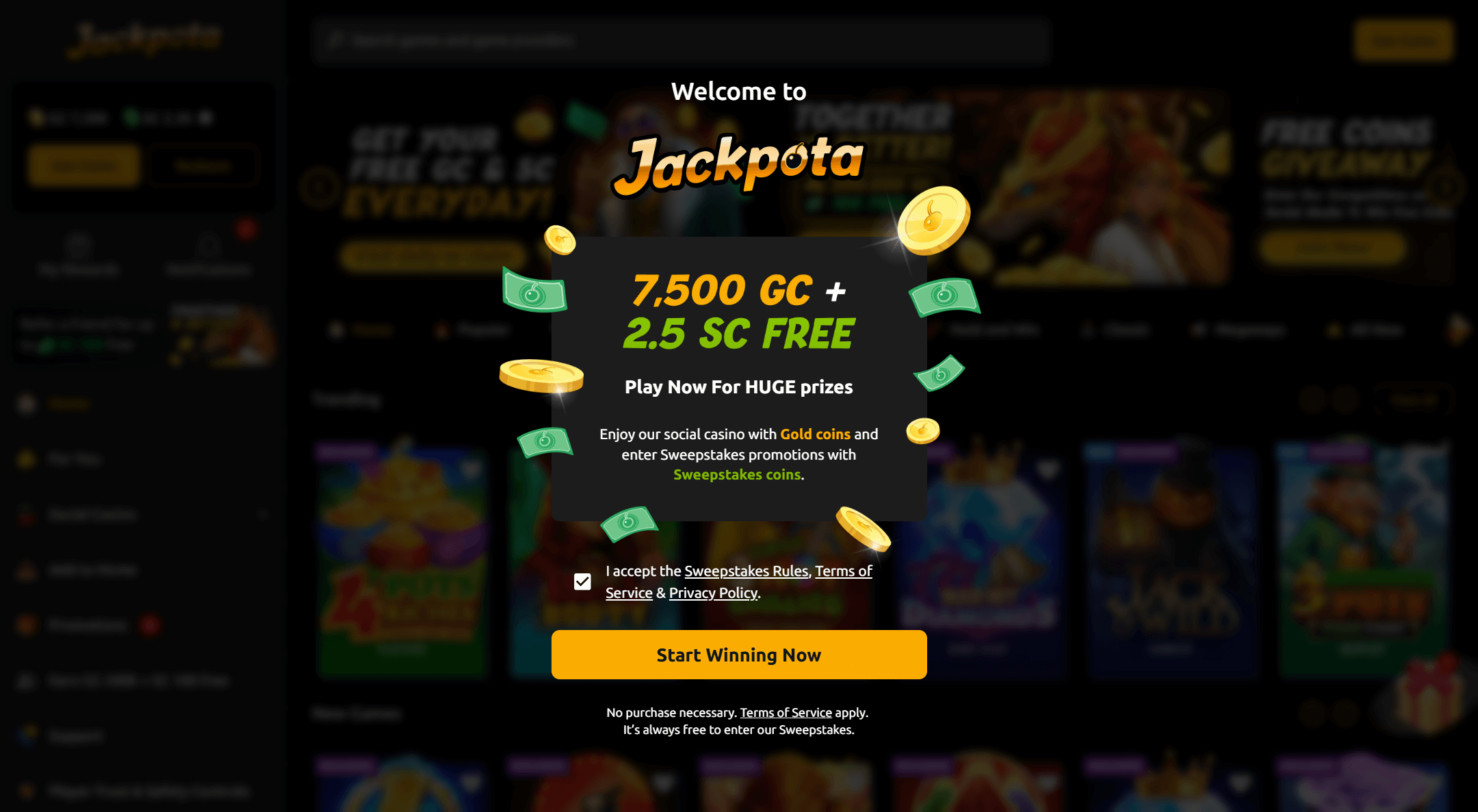 Jackpota lays out a good no deposit bonus for an online casino: an instant 7,500 Gold Coins (GC) + 2.5 Sweeps Coins (SC) for all new signupsâno code, no payment, just verify and go. There is also a daily bonus which is somehting to take into account if you were looking for a good option to make your casino experience better and longer. The first three purchases get hefty matched packs; e.g., $9.99 scores 50,000 GC + 25 SC, $19.99 boosts you to 80,000 GC + 40 SC (+freespins). Ongoing logins, mail-in offers, and exclusive bonus code casino promos keep the momentum up. Playthrough on SC is just 1x; all major slots and table games are unlocked from day one.