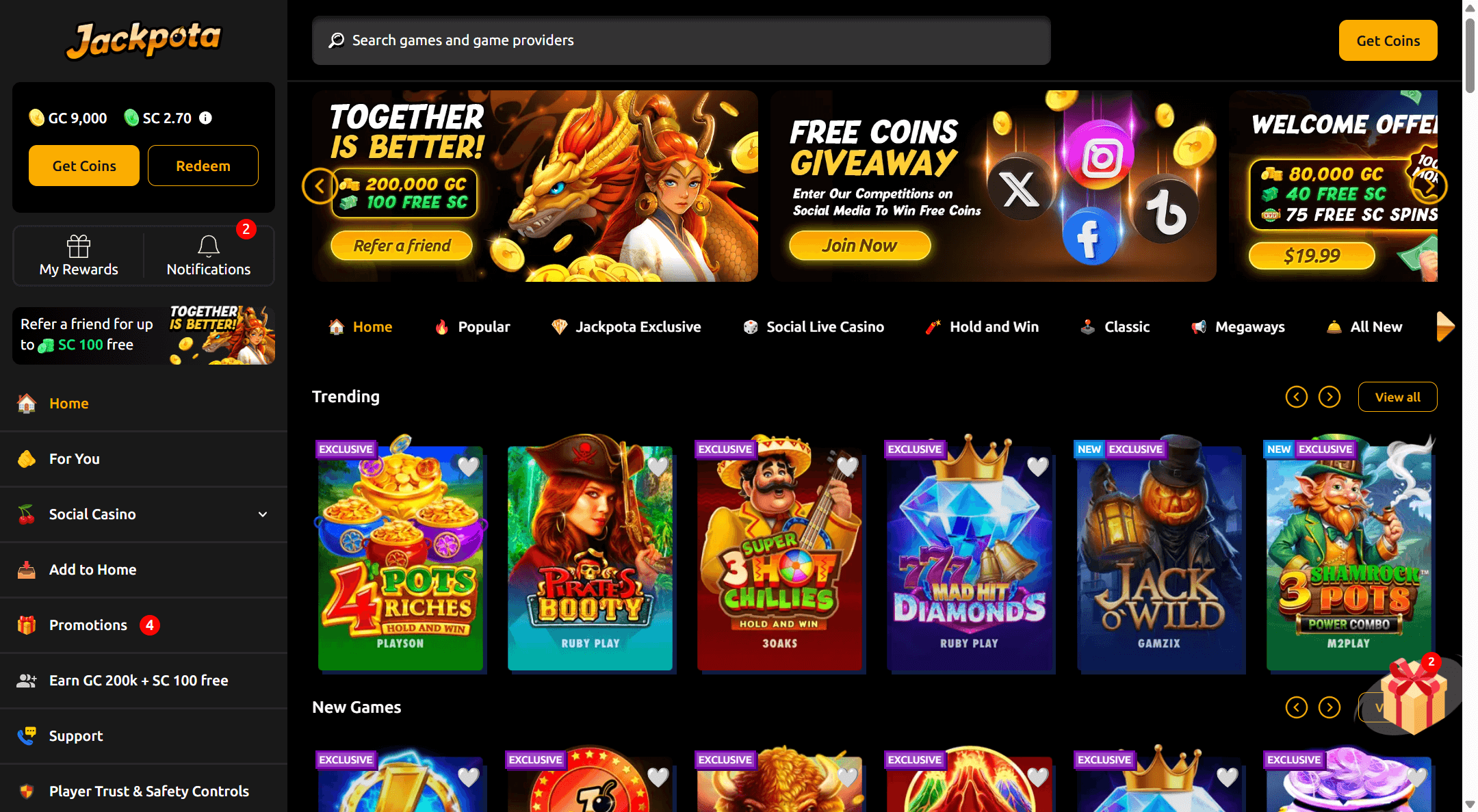 Jackpotaâs DNA: regular Facebook & X contests, social-only promo codes, and referral competitions targeting fresh GC/SC drops every week. Onsite challenges pop up around new slot launches, while the leaderboard structure adds a strong sense of progression. Discord and P2P modes are still pending; their addition would put Jackpota neck and neck with the leaders for community engagement.