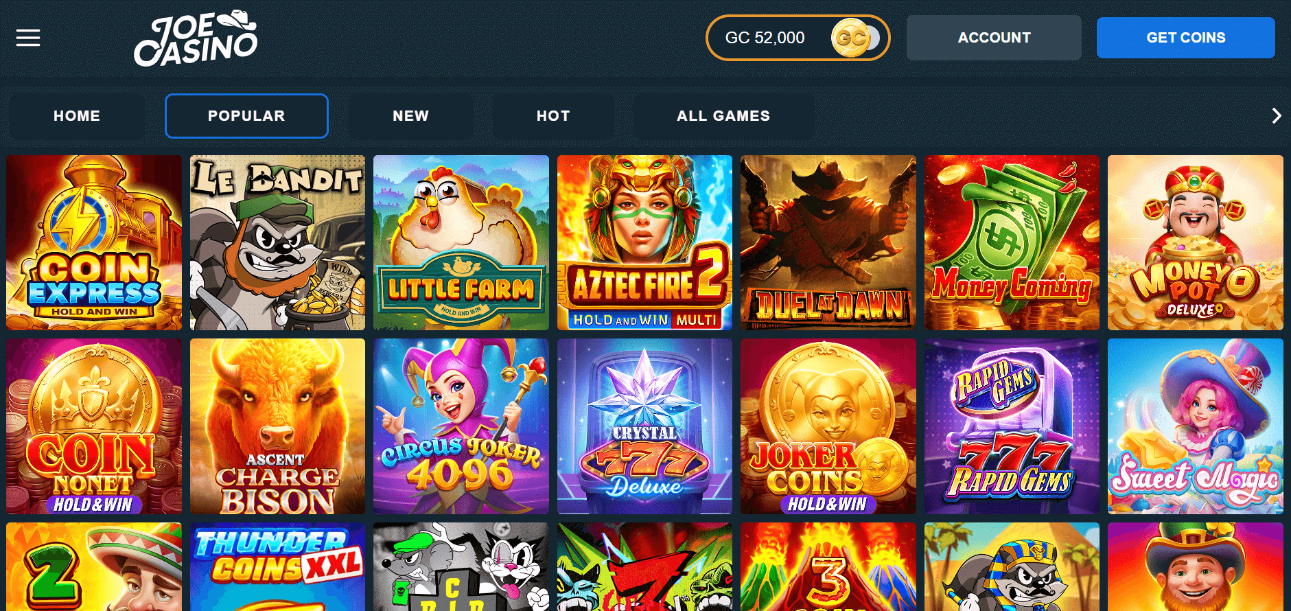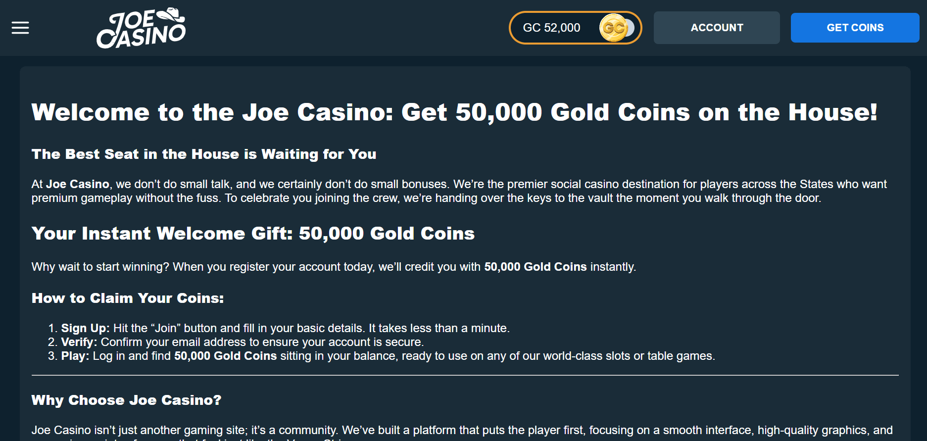 The welcome package at Joe Casino delivers 50,000 Gold Coins immediately upon registration, no promo code or email verification hurdles required. I appreciated the instant delivery, the coins hit my account within seconds of signing up, making this one of the smoothest onboarding experiences I've tested recently.