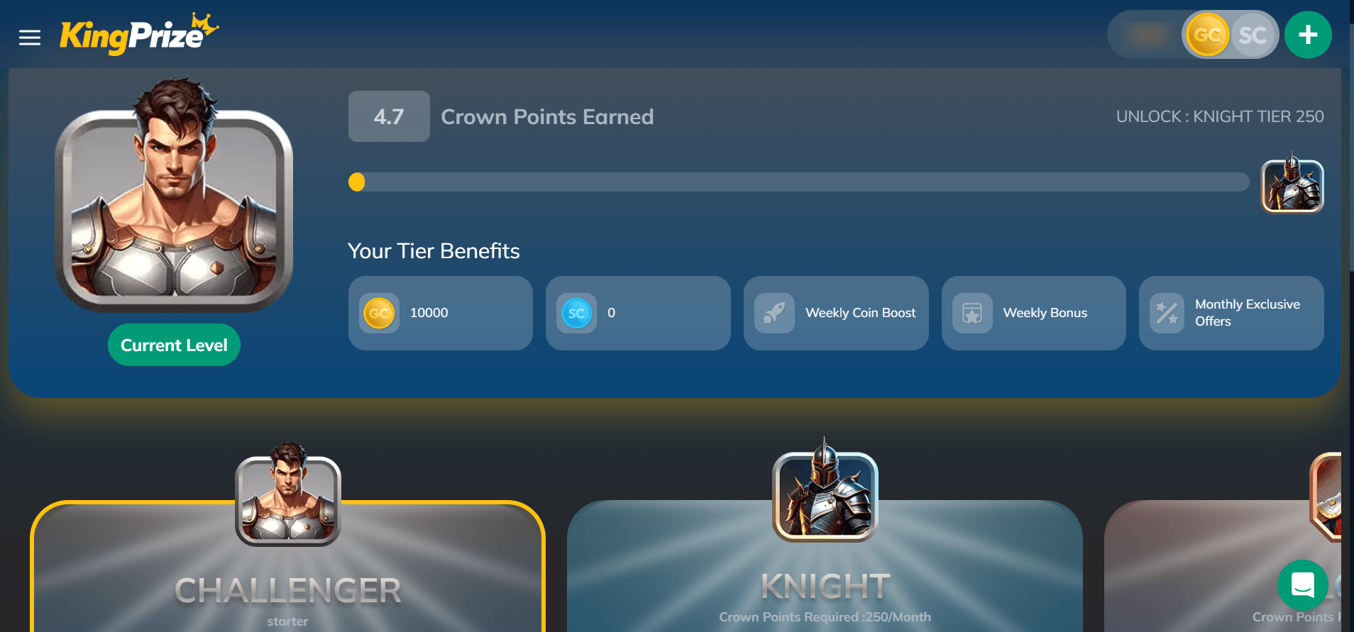 The VIP structure at KingPrize progresses through five tiers starting at Challenger, then advancing to Knight, Lord, Baron, and ultimately Duke level. I earned Crown Points through regular gameplay and coin purchases, with each tier unlocking progressively better weekly coin boosts, monthly exclusive offers, and priority customer support access.