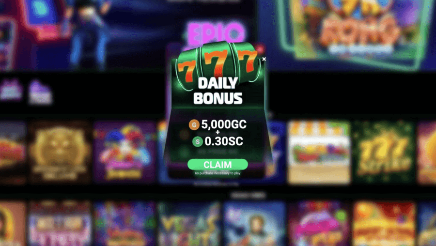 | Daily Login Claim | Log in and click claim button. | 5,000 GC + 0.30 SC per day. | Guaranteed once per day when active; probabilities not disclosed. |
