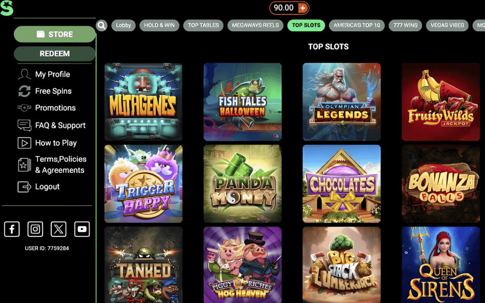 The LoneStar lobby is heavily slotsâdriven, with well over 500 games available when you factor in both reels and side categories. The visual design uses big, colorful tiles for titles like âMutagenesâ, âFish Tales Halloweenâ, âOlympian Legendsâ, âTrigger Happyâ, and âPanda Moneyâ, arranged under tabs such as Top Slots, Hold & Win, Megaways Reels, and Vegas Vibes. Navigation feels intuitive thanks to the leftâhand menu for Store, Redeem, Free Spins, Promotions and Help, and the top menu for different slot styles and âAmericas Top 10â.