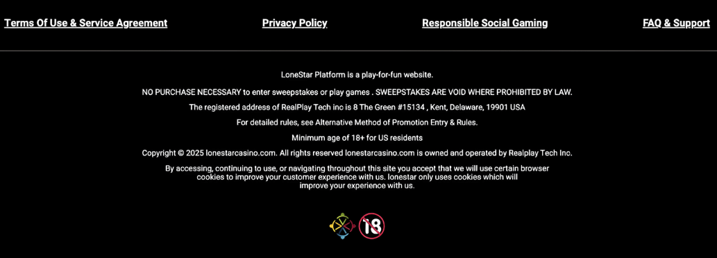 LoneStar is operated by RealPlay Tech Inc., Delaware, USA, and the footer clearly states that it is a âplayâforâfun websiteâ operating under a sweepstakes model. The text also notes that âno purchase [is] necessary to enter sweepstakes or play gamesâ and that âsweepstakes are void where prohibited by lawâ, highlighting that it is not a traditional realâmoney online casino. The platform restricts participation to players aged 18+ in the United States and explicitly indicates that sweepstakes are unavailable in locations where local rules do not permit them.