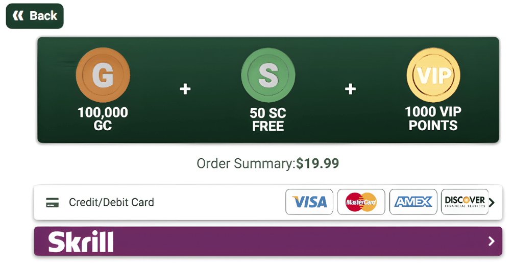Purchases can typically be made via major credit and debit cards plus digital wallets like Skrill, with payment logos such as Visa, Mastercard, Discover and American Express clearly displayed at checkout. As with most sweeps platforms, the working assumption is that 1 SC is treated as roughly equivalent to 1 USD in redeemable prize value once all sweepstakes conditions are met. Pricing feels broadly in line with other leading sweeps sites, with midâtier packs providing the strongest relative value.