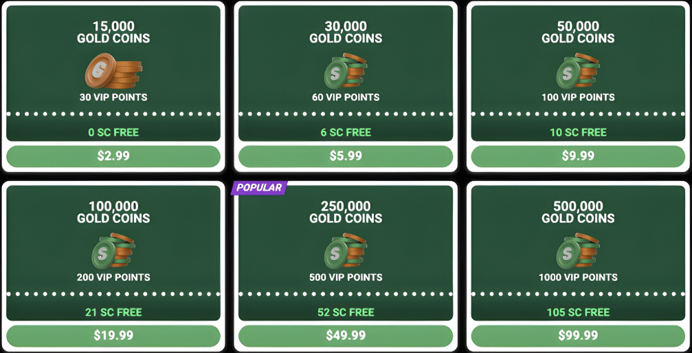 The main firstâpurchase package marketed as a standout value gives 100,000 Gold Coins plus 50 Sweeps Coins and 1,000 VIP Points for $19.99, with smaller and larger tiers available depending on budget. Other store bundles scale from 15,000 GC with 0 SC all the way up to 500,000 GC with 105 SC free, each tied to increasing VIP points. As with most sweeps casinos, Sweeps Coin play is subject to playthrough and eligibility rules before redemptions.
