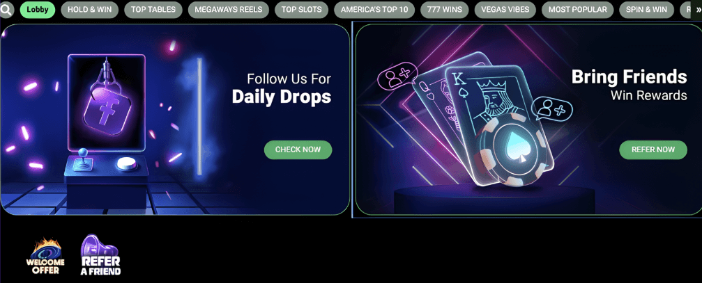 LoneStar does not center its loyalty system on a flashy wheel, but it layers several recurring mechanics together: daily login bonuses, social âdaily dropsâ promotions, and VIP point accrual every time you buy a Gold Coin package. In the lobby banners you will see calls to âFollow Us For Daily Dropsâ and âBring Friends, Win Rewardsâ, both of which funnel you toward social media giveaways and the referâaâfriend program rather than pure chanceâbased wheels. LoneStar truly does an awesome job when it comes to bonuses and rewards, some of the best available in the sweepstakes market.Â