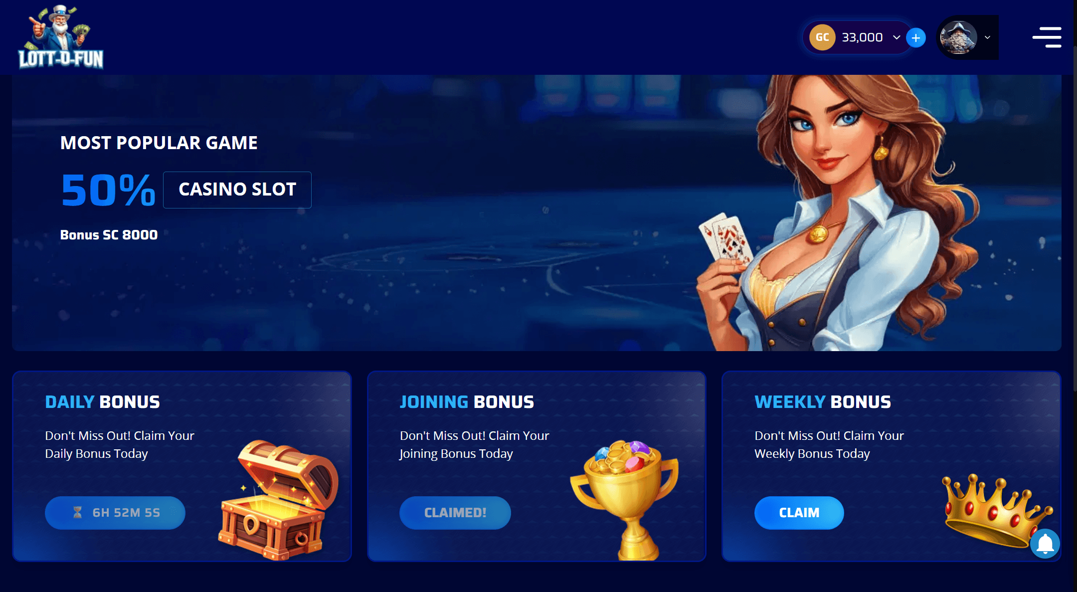 My first impression of the Lott O Fun welcome was that it looks generous on the surface , but it is not quite as clean or clearly explained as the best rivals in the space. The headline offer I could actually confirm across listings was 2 Sweeps Coins and 30,000K Gold Coins and then you can further combaine this welcome offer with the daily style rewards , which is nice for testing games but not exactly life changing. I like that you can use Gold Coins for casual play and Sweeps Coins for entries that may be redeemed for prizes , but the lack of a fully transparent bonus hub on site and some mentions of “missing” promos in third party reviews made me feel cautious.