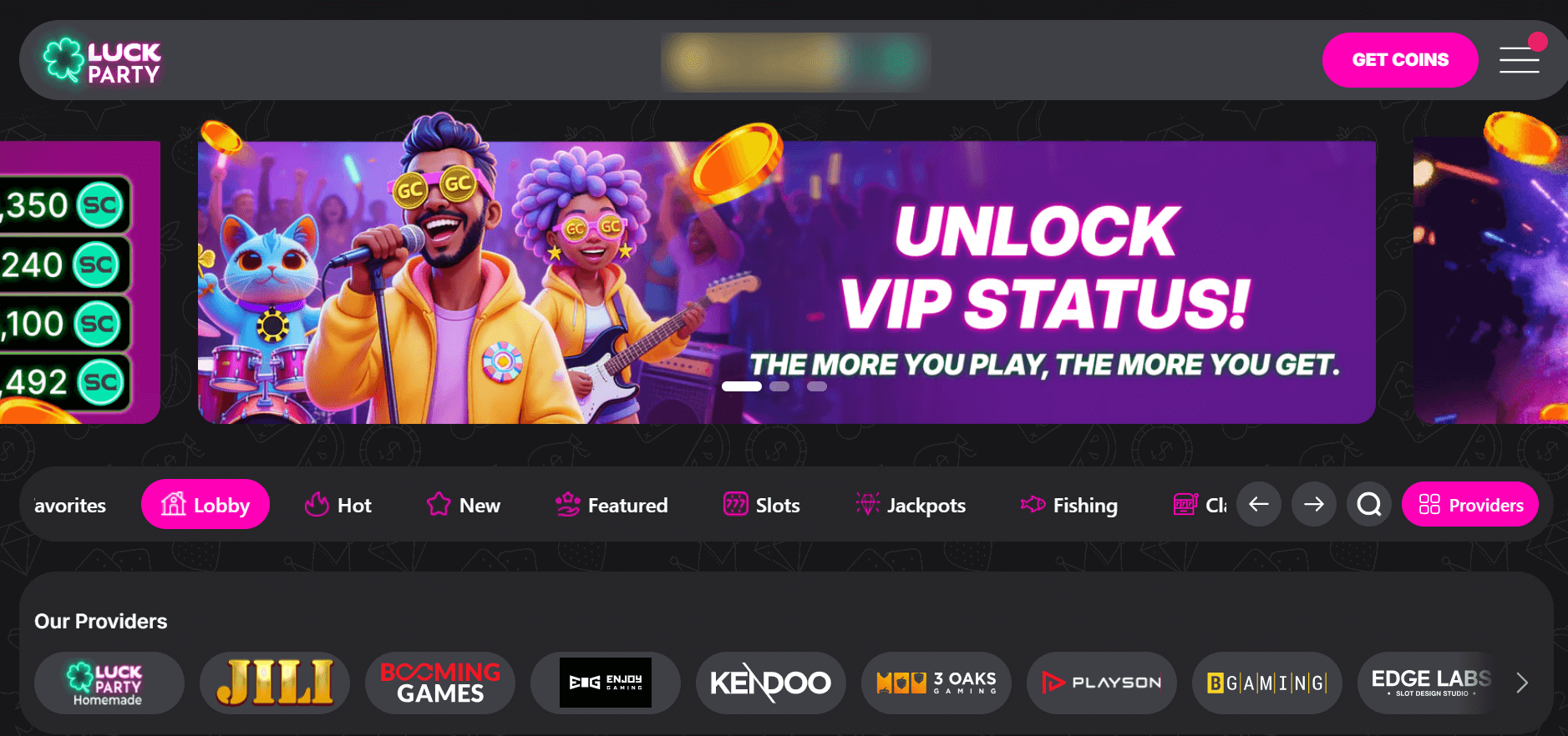 Luck Party leans heavily into its party branding, and that shows up in the way it structures social mechanics around daily engagement and shared experiences. The platform is visibly active on channels like social media and uses Lucky the Neon Cat DJ as a recurring character for surprise drops, streak rewards, and themed events that give the lobby some personality beyond just spinning reels.