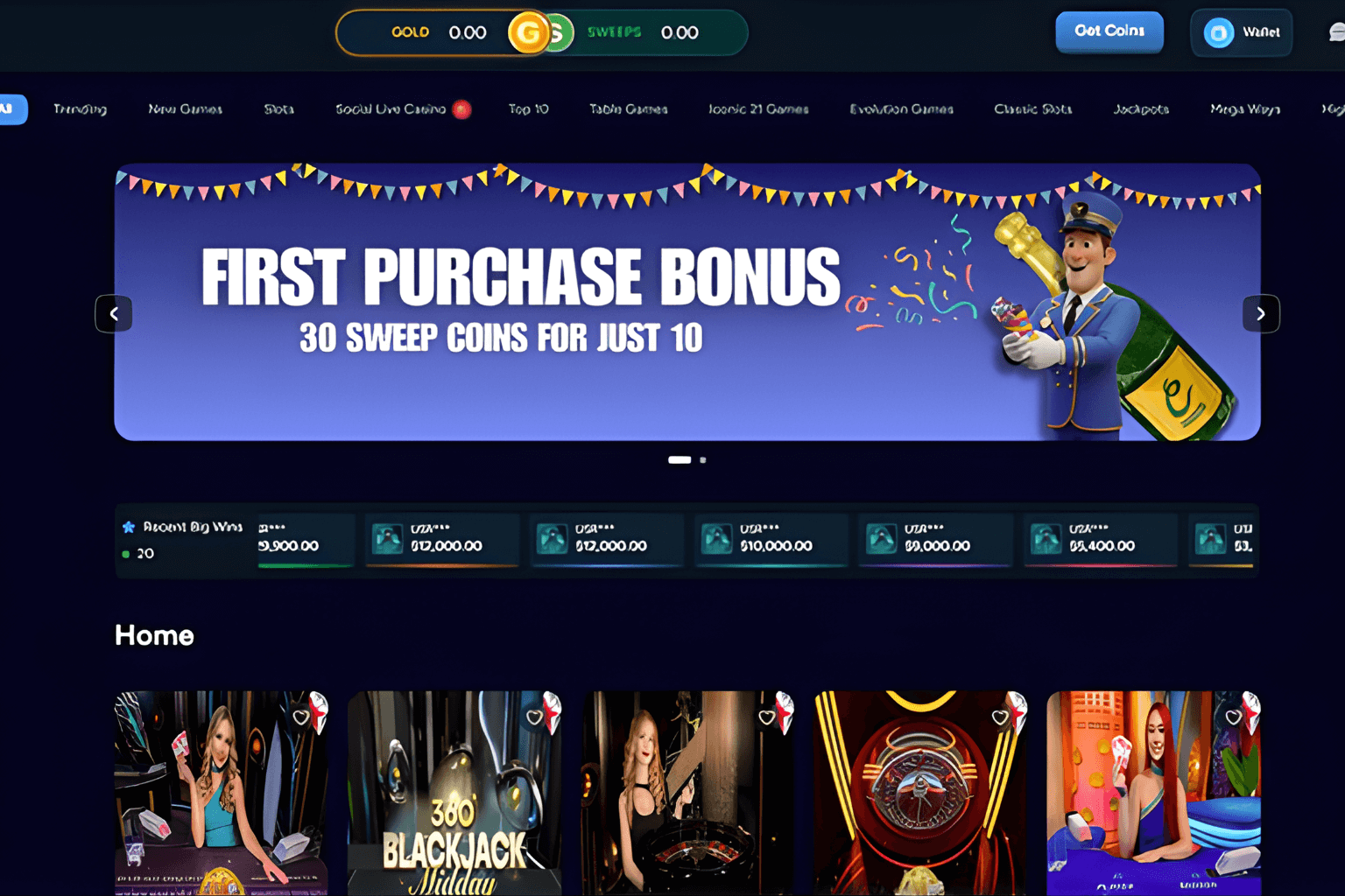 | 300,000 GC + 30 SC (First Purchase $9.99) | 1x playthrough on SC | None stated | All games | 100 SC minimum (bank), 25 SC (gift cards) |