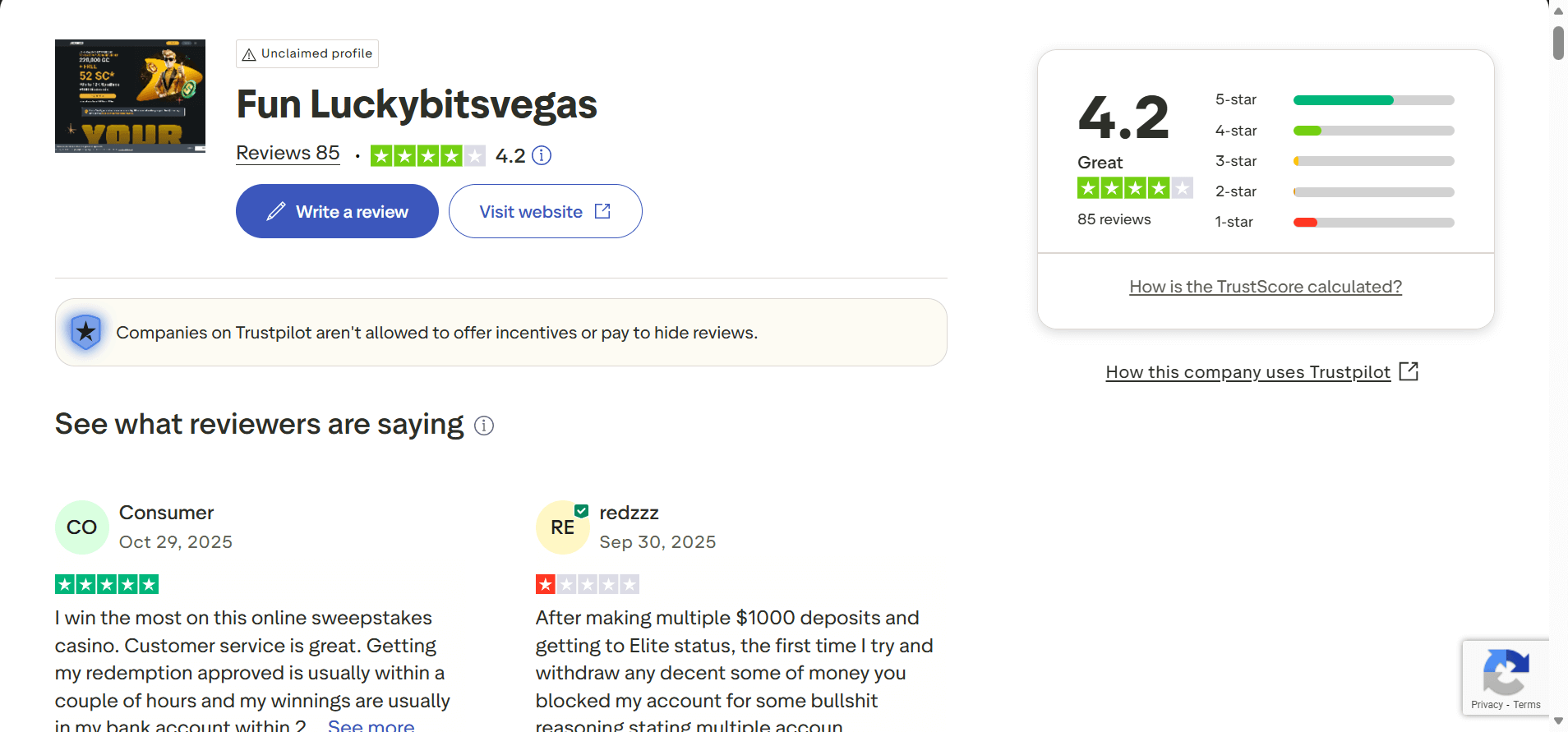 Lucky Bits Vegas maintains a developing online reputation with mixed user feedback across independent review platforms. As of November 2025, the platform holds a 4.2 rating on Trustpilot, though it's important to note this rating appears to be confused with Lucky Vegas (a different platform) based on review content referencing UK players and features not present at Lucky Bits Vegas.