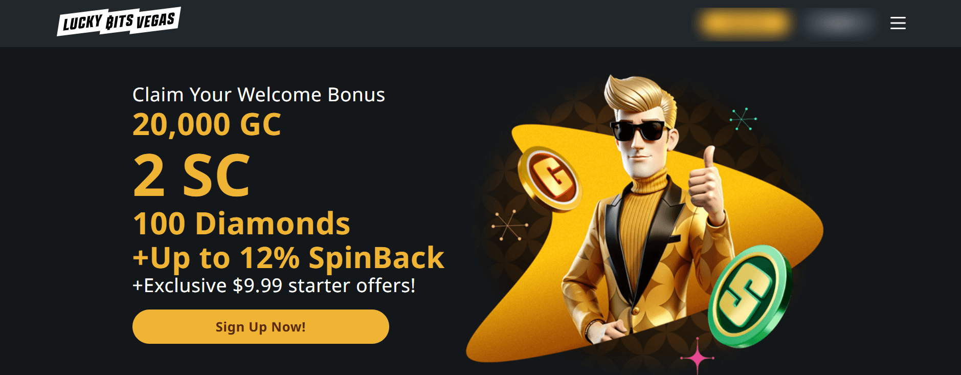 The Lucky Bits Vegas welcome package is one of the most generous I've encountered in the sweepstakes casino online space. New players receive 20,000 Game Coins, 2 Sweeps Coins, 100 Diamonds for in-game power-ups and up to 12% SpinBack on losses, all without entering a promo code. I was genuinely impressed by how this offer positions new players for immediate gameplay across their entire library without the restrictive terms that plague other platforms.