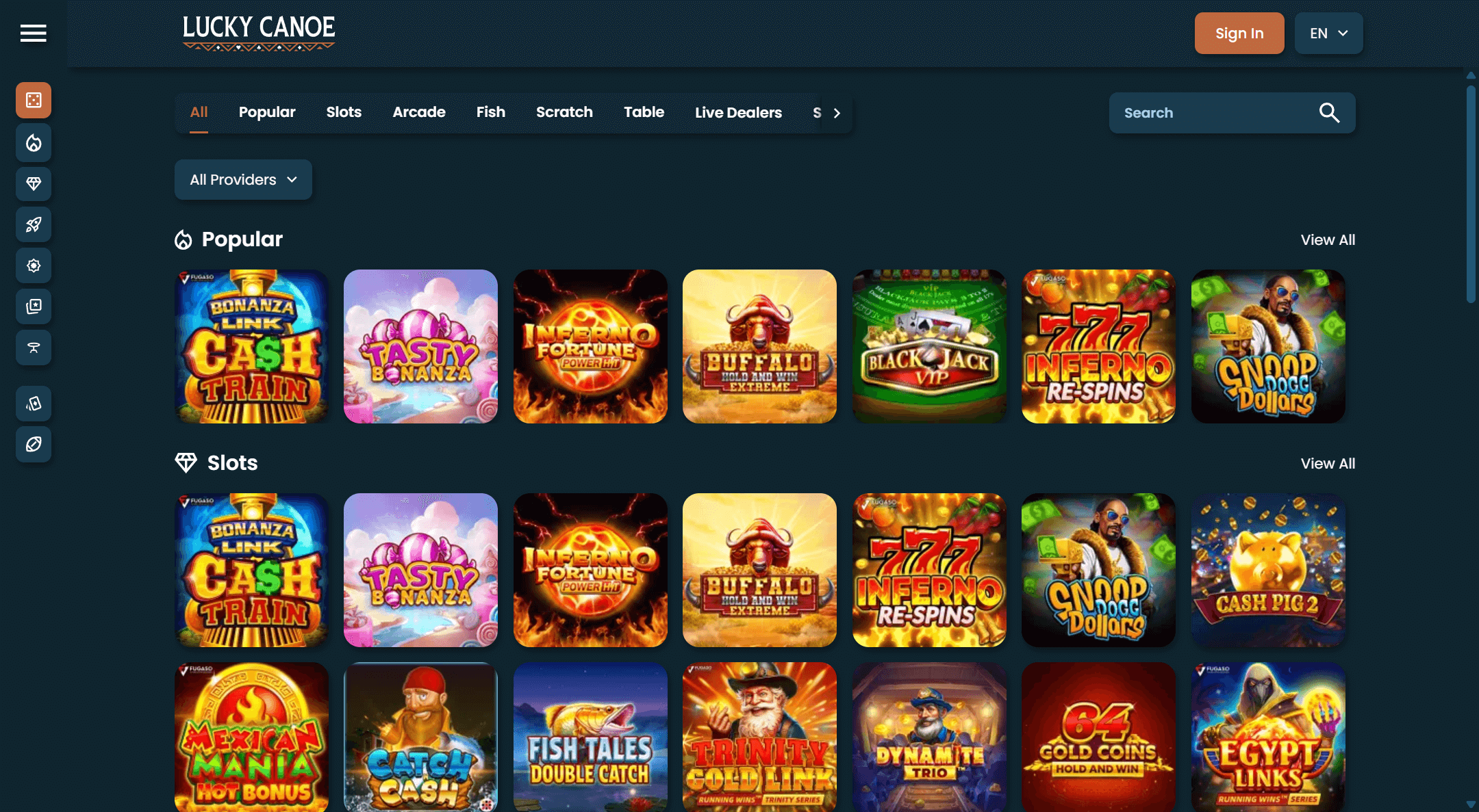 Lucky Canoe surprised me with its sheer library size: over 1,500 games, mostly slots but also fish shooters, arcade, and even a fully-fledged social sportsbook. The sports side is pretty impressive; I could bet on NBA, NFL, baseball, even eSports with Gold or Sweeps Coins. Where the site disappoints is variety for high-rollers: few Megaways, no sitewide progressives, and some major slot suppliers missing, notably Hacksaw, Nolimit, or NetEnt. For more classic slots, Mega Bonanza Casino, does it better.