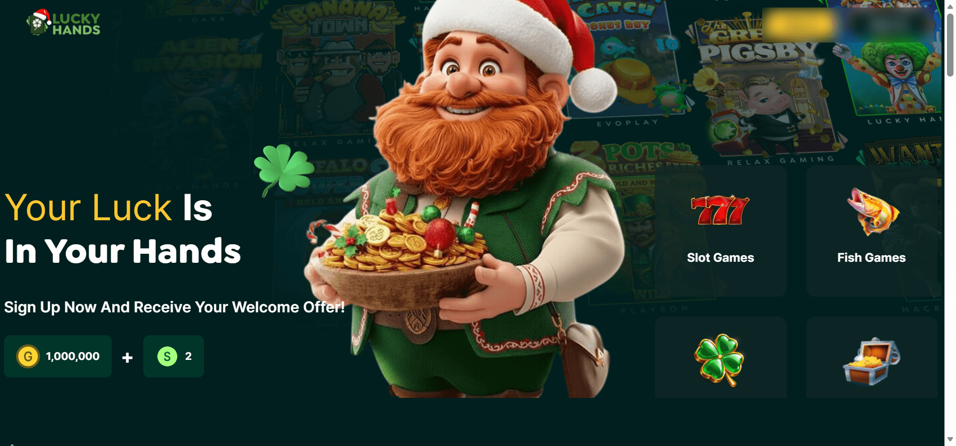 The Lucky Hands welcome offer delivers a massive 1 million Gold Coins + 2 Sweeps Coins immediately upon registration, no purchase required.
