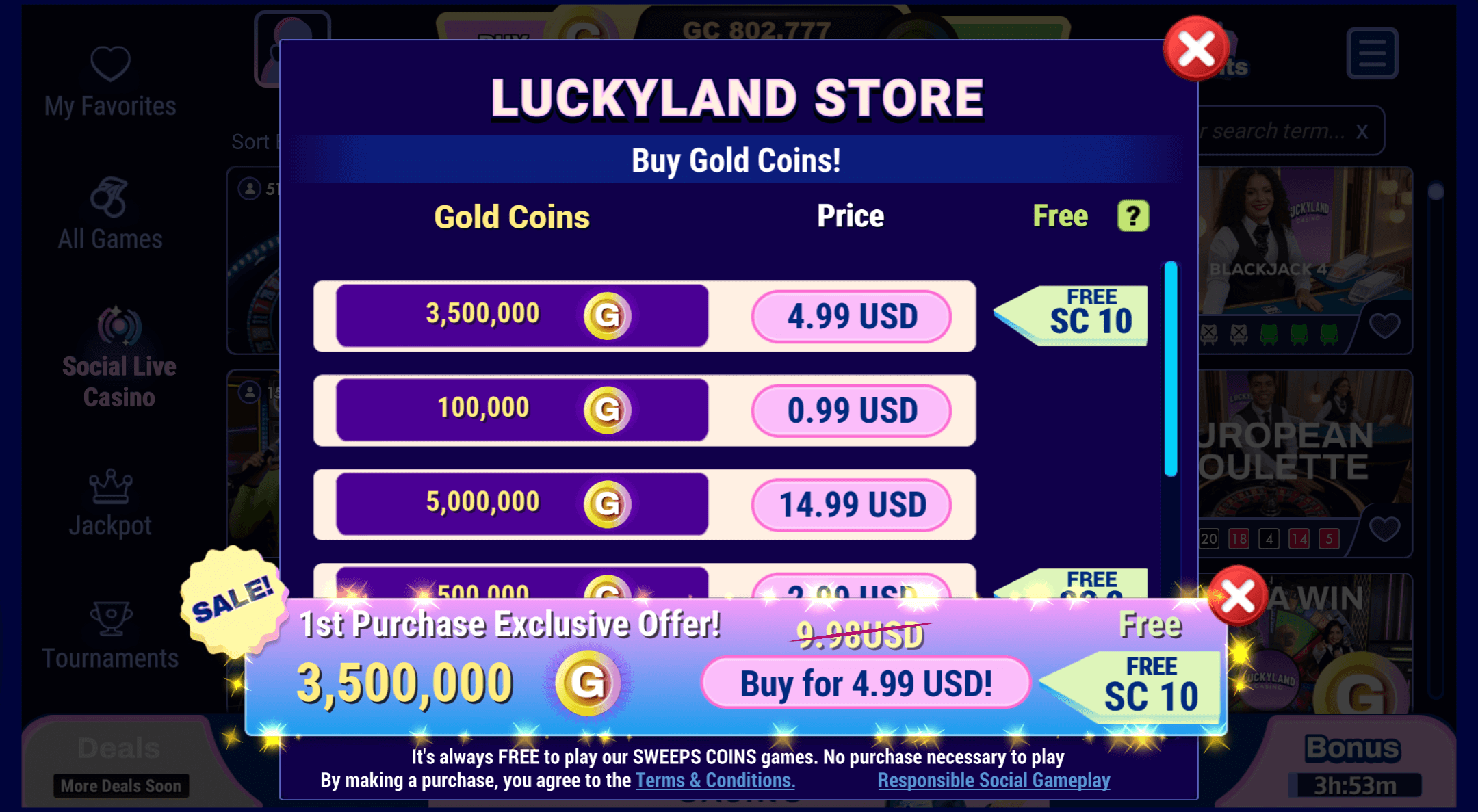 | First purchase bonus, 3,500,000 Gold Coins + 10 Sweeps Coins for $4.99 equivalent | Playthrough on Sweeps Coins only, 1x style requirement on SC wins before redemption consideration | Applies to first qualifying purchase only, subsequent purchases follow standard coin package terms | Gold Coins for entertainment only, Sweeps Coins playable for redeemable prize potential on eligible slots | SC winnings can be redeemed after KYC verification and meeting minimum SC redemption threshold |