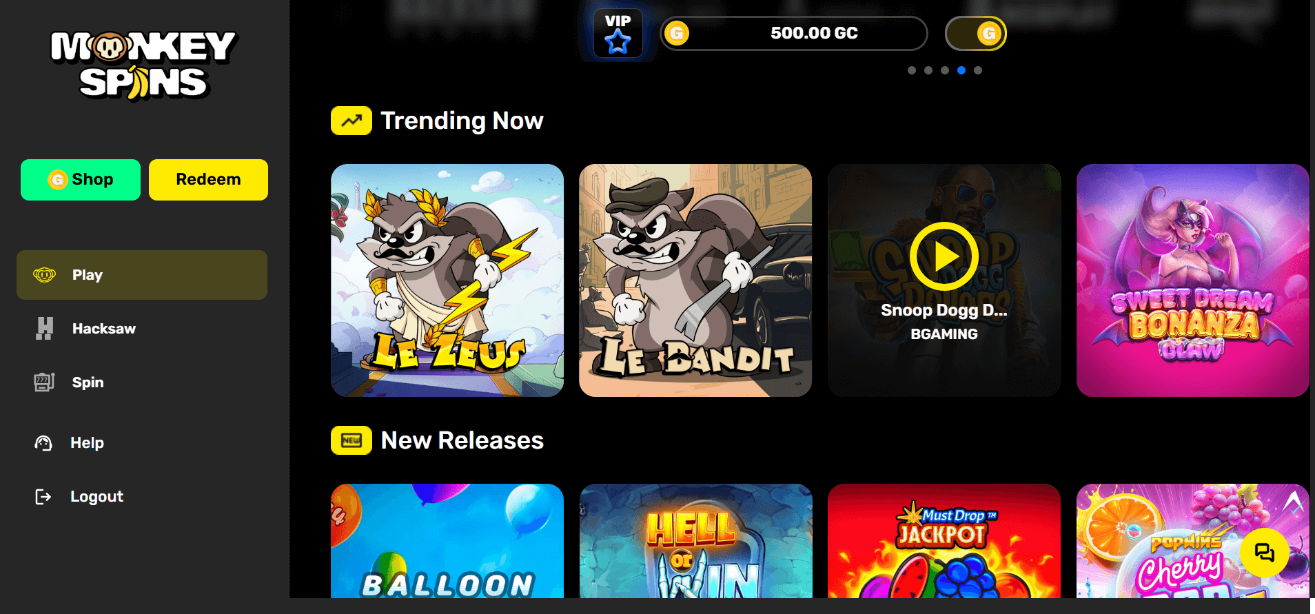 Monkey Spins maintains industry-standard currency operations with Gold Coins for entertainment play and Sweeps Coins for prize redemption at a 1:1 USD ratio.