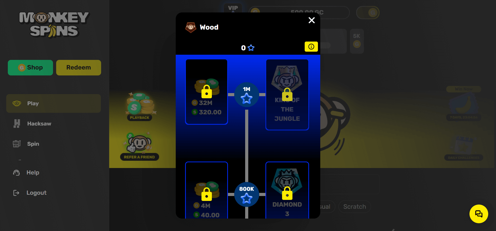 Monkey Spins stands out in the sweepstakes casino landscape with its impressive 12-tier VIP program that genuinely rewards player loyalty through substantial escalating benefits. The star-based progression system creates meaningful advancement goals, with rewards that scale dramatically from the entry-level Wood tier all the way up to the coveted "King of the Jungle" status.