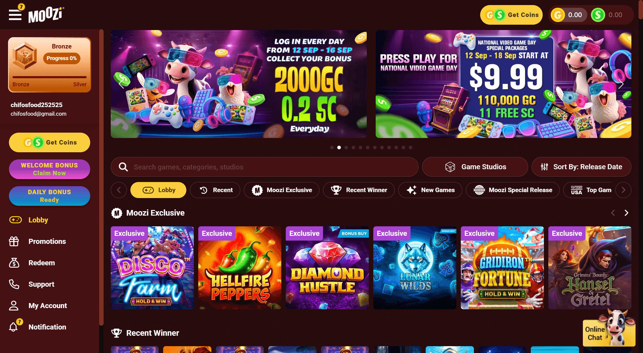 The no-deposit bonus is instant and requires no code, that means I got showered with 20,000 Gold Coins (GC) + 1 free Sweeps Coin (SC) just for signing up and verifying. Combining that with the daily login bonus which can net you up to 3,000 GC + 0.3 SC and it's easy to see how Moozi made such a great first impression on me as a player.