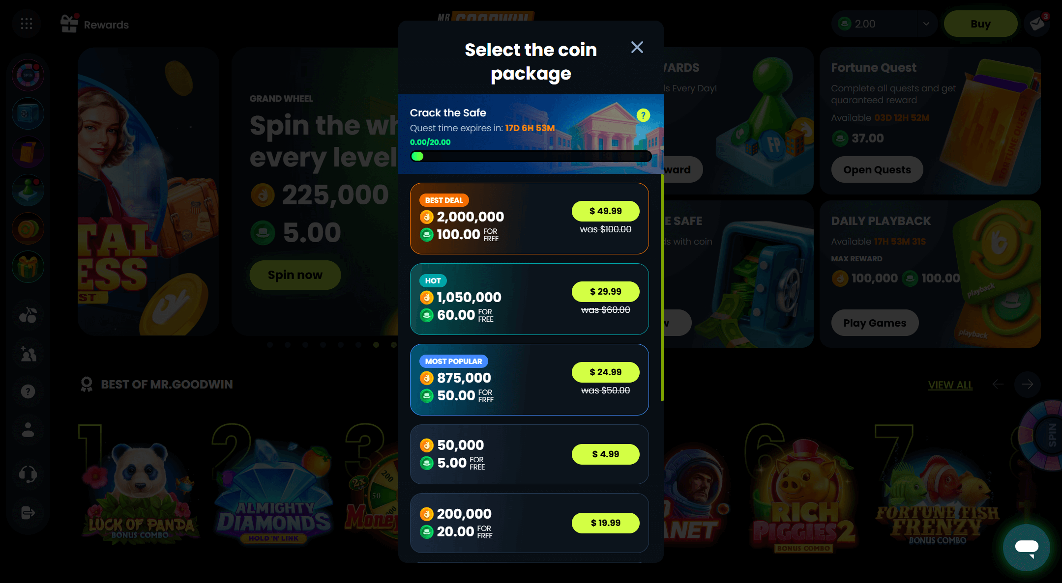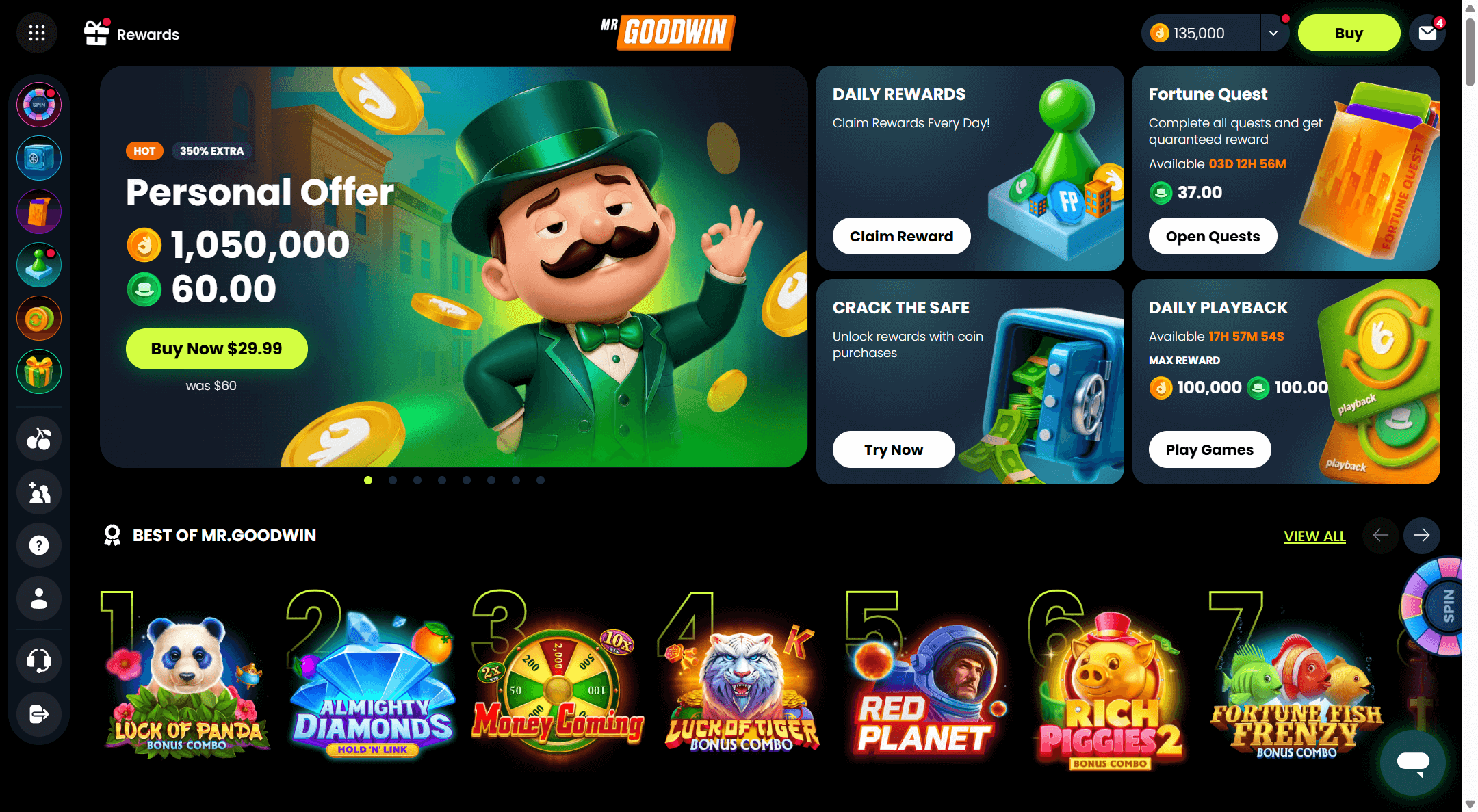 If youâre like me and join a sweepstakes casino for the promise of easy bonuses, Mr.Goodwin will leave you mostly satisfied. The Gold Coin (GC) welcome is loud and generous. I landed 160,000 GC plus 2 Sweep Coins (SC) simply for registering and verifying my email and phone. But I was hoping for more from the SC side of things, and after digging around, discovered that you wonât get a fat SC stack up frontâŚunless you start making purchases. Free Plays (FP) are a neat addition, earned through repeated purchases, but theyâre just spins â not true Sweeps Coins. Daily logins do deliver extra free spins and GCs, and the overall volume of promos is impressive even if some are just so-so in value.