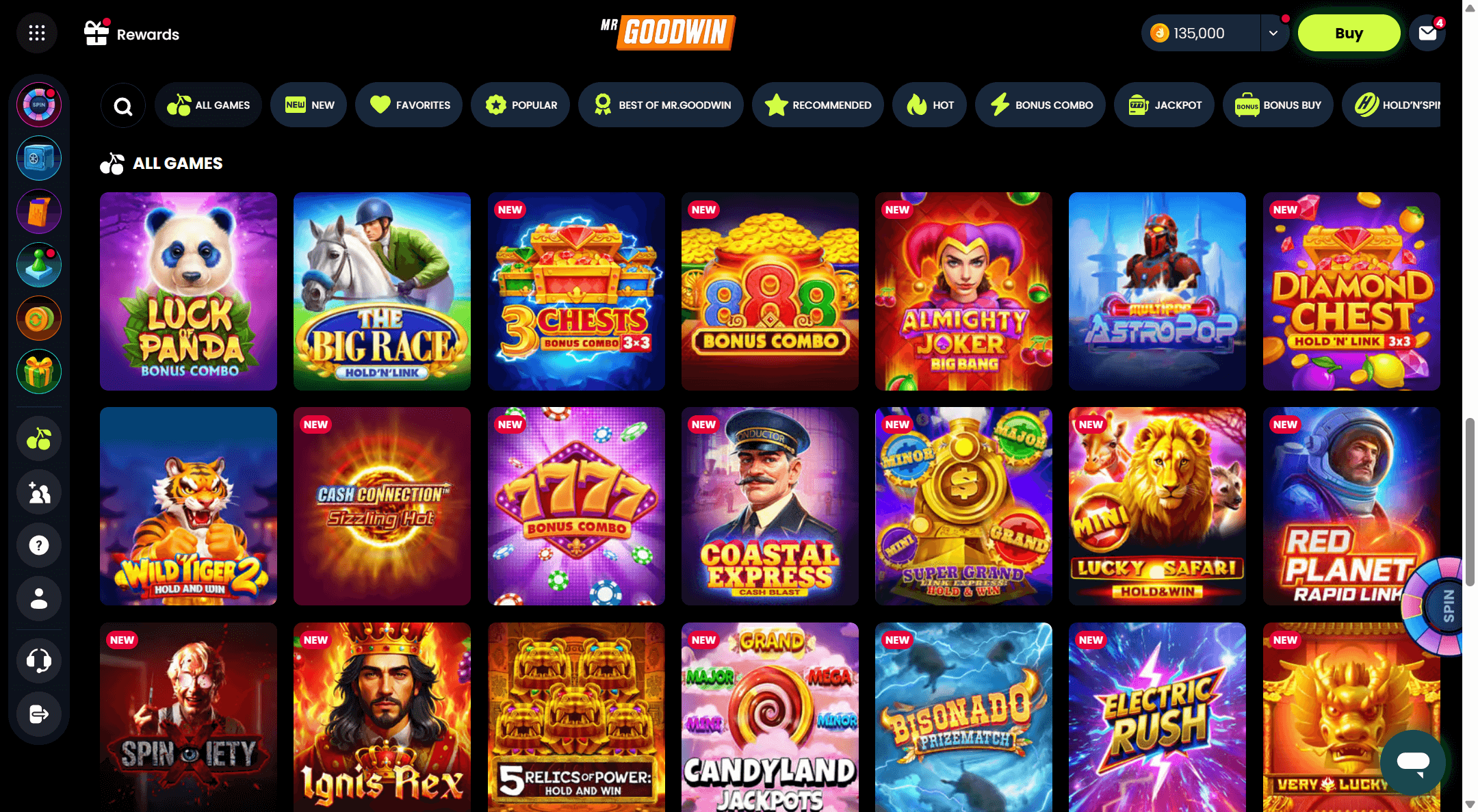 Let me be brutally honest: at Mr.Goodwin, itâs all about slots. As a fan of âslots free games,â I actually relished getting lost in a sea of more than 1,000 titles from developers like 1Spin4Win, Betsoft, BGaming, Evoplay, Kalamba, Novomatic, and others. That means Megaways, bonus buys, new releases, all the flavors youâd find at the best sweepstakes platforms, but donât come here hoping for table games, live casino action, or even bingo â there literally arenât any right now.