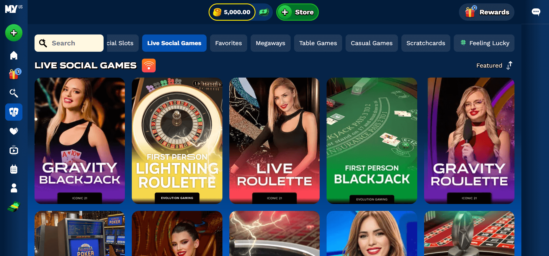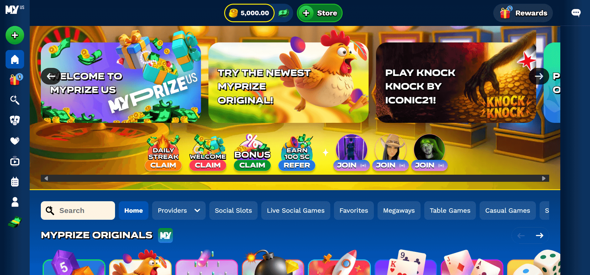 MyPrize is a “social-first” casino: multiplayer Bet Together rooms, live streaming, Discord drop-in, and daily leaderboard/XP races. Refer-a-friend and social media bonuses (with up to 10 SC) are easy to claim. In-room chat works even in demo mode—one of my favorite ways to meet rival sweepers.