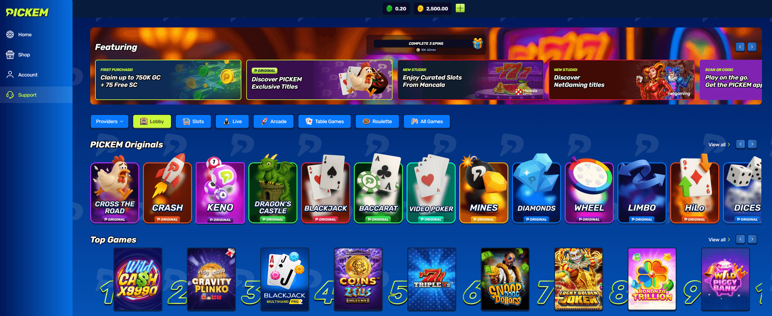 - Other: Plinko, crash, keno, scratchcards, wheel games, dice, video poker, and PICKEM Originals like Cross the Road and Crash.