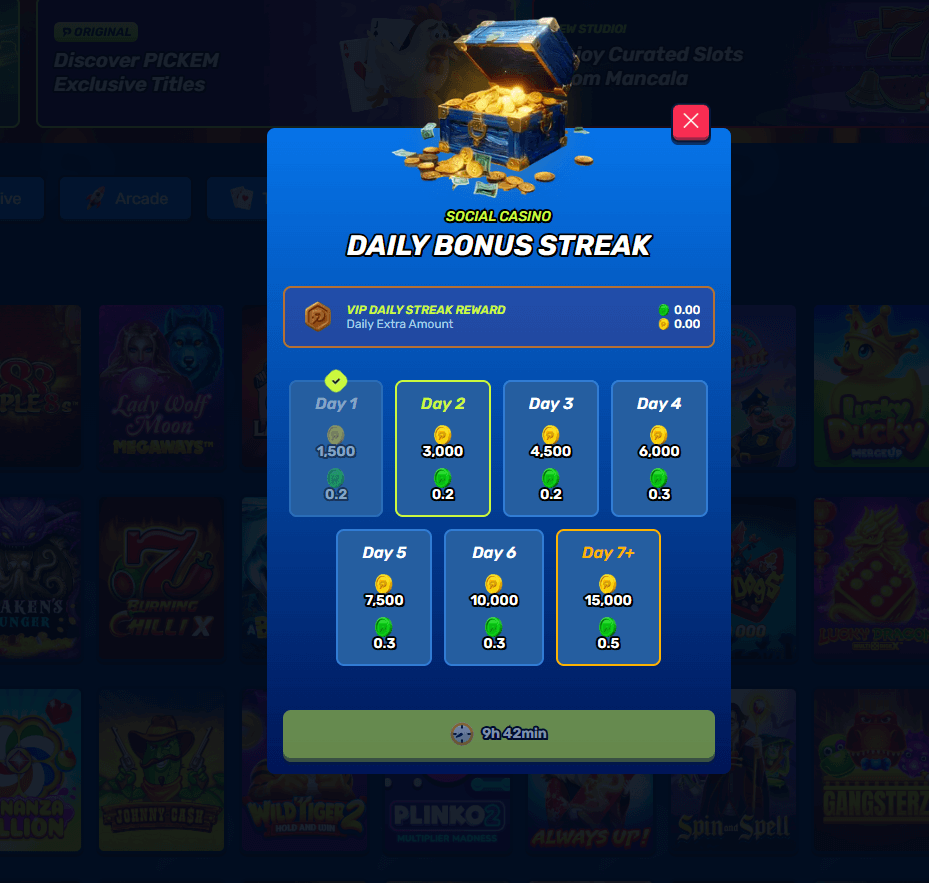 PICKEM opens with a 50,000 Gold Coins + 1 Sweeps Coin no-deposit bonus once you register, verify your phone, and confirm your account, giving enough balance to explore slots and table games without buying packs. First purchases are structured as six high-value GC bundles, with headline deals running up to 1,000,000 GC + 50 SC and ultra-cheap intro packs like 60,000 GC + 6 SC for $0.99 and 120,000 GC + 12 SC for $1.99, which equate to unusually strong percentage boosts compared to many new sweepstakes casinos. Daily login rewards scale up to 20,000 GC + 0.5 SC from Day 7 onwards, and you can claim 1,000 GC “refills” whenever you bust, while a mail-in AMOE route provides 3 SC per approved letter.