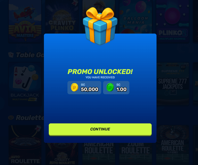 | No-deposit sign-up | 50,000 GC + 1 SC | Account and phone verification; SC must be played before redemption | Granted on registration; subject to inactivity expiry in rules | Usable on most casino games (slots, tables, arcade) |