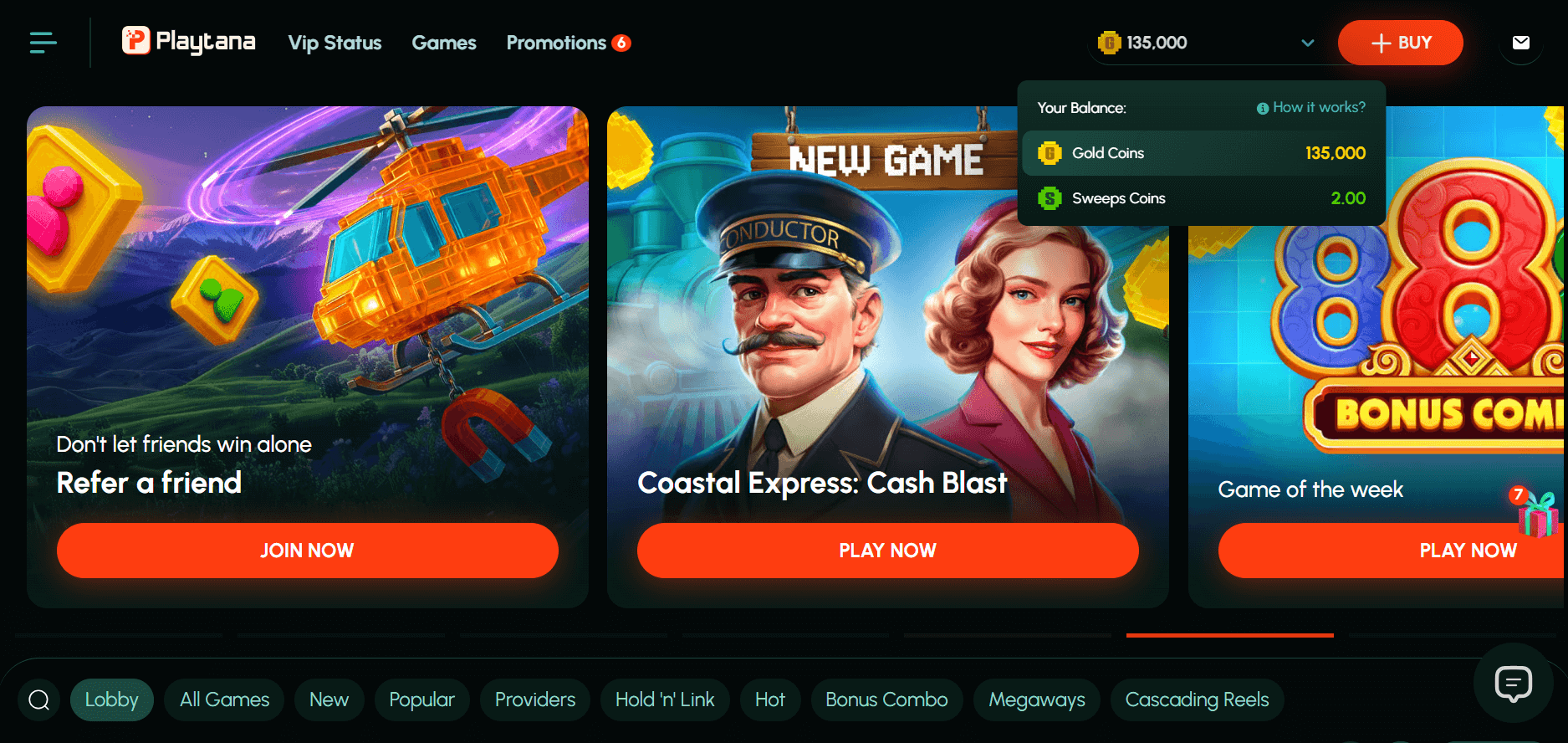 The no deposit bonus at Playtana gives first time players 135,000 Gold Coins + 2 FREE Sweeps Coins, to test and explore the platform's expanding slots library.