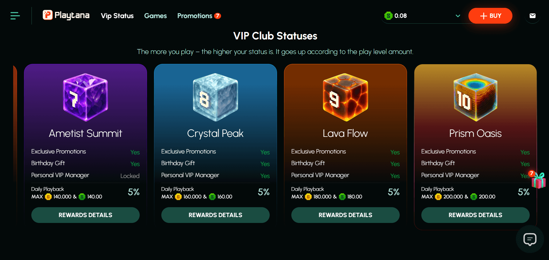 Playtana presents a good 10 tier VIP system. New players are automatically thrown into the entry level Grassland tier with the goal being to climb to the final tier: "Prism Oasis". As you expect you level up by playing the free slots games, the higher you climb the better the rewards.
