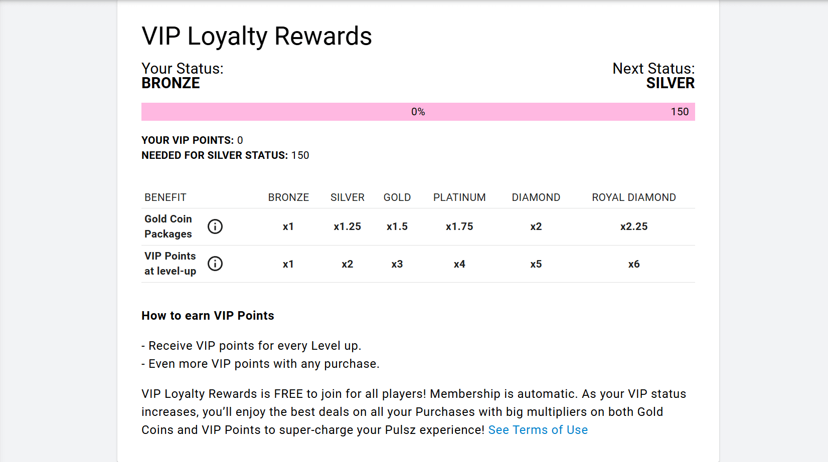 Bronze | 1 free GC + 1 VIP point per GC purchase | Start |