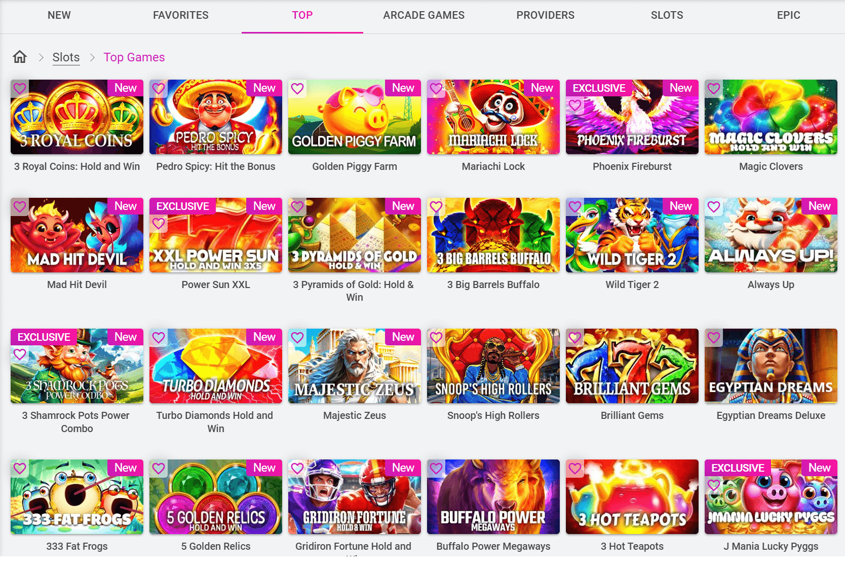 - Game filters: By type, provider, feature, theme