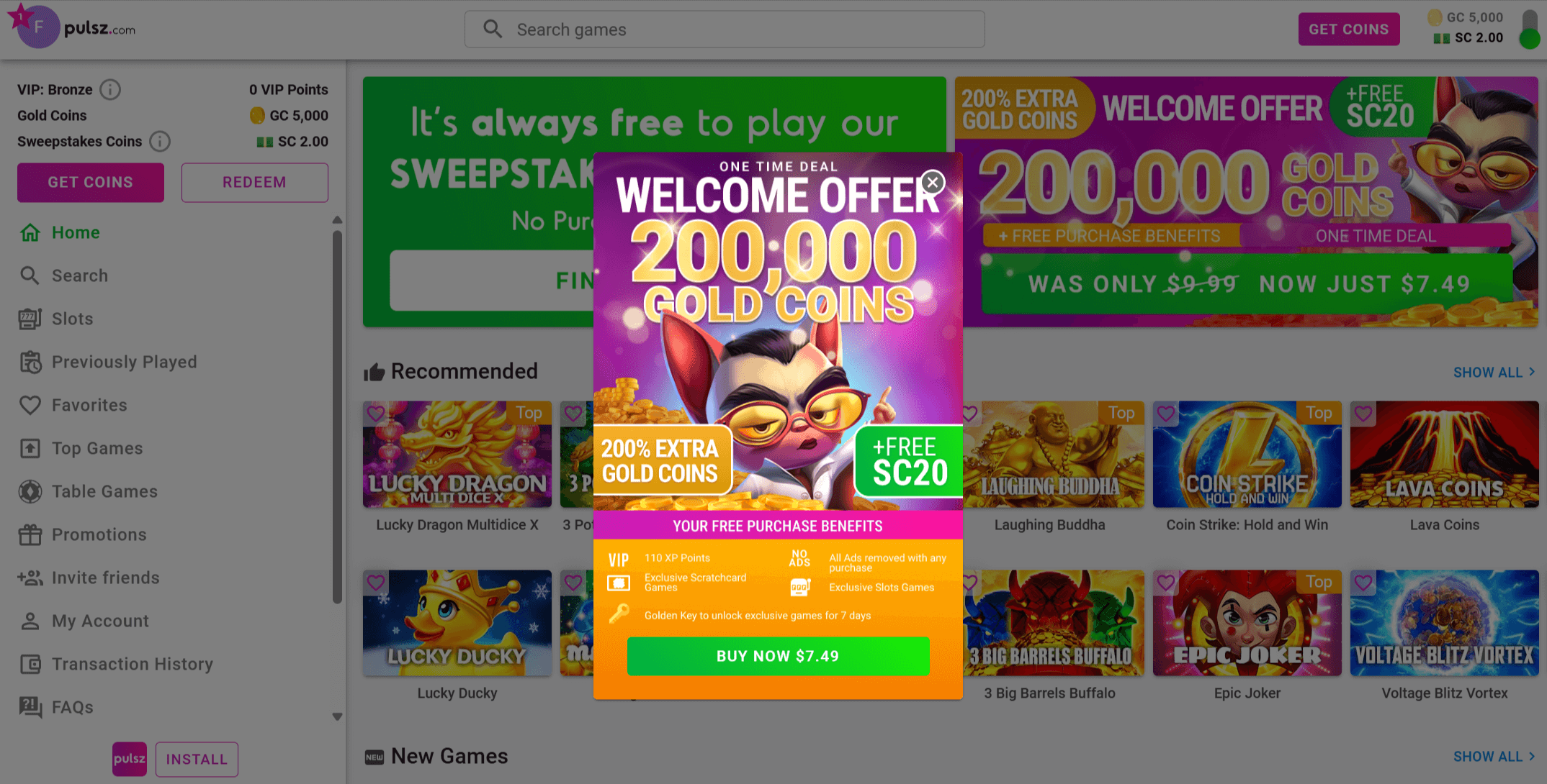 Pulsz accepts Visa, Mastercard, Discover, AmEx, Diner’s Club, JCB, Skrill, ACH e-check, Online Banking, Prizeout, Apple Pay, and Google Pay. Purchases start at $1.99, with the best bonus value at $19.99 and up. No PayPal or crypto. Every bundle brings bonus SC, with fuller details below.