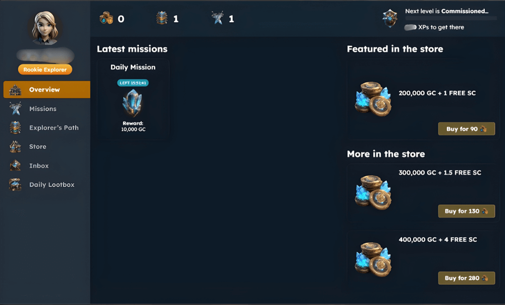 The Daily Lootbox adds unpredictability that kept my sessions engaging. Instead of fixed login rewards, I navigated a treasure map interface to unlock chests containing anywhere from 25 GC to 0.5 SC, with occasional bonus mission unlocks. Missions appear as daily and weekly quests that award XP and SC upon completion, creating an achievement loop that extends beyond simple spinning. The referral program takes a non-standard approach, rather than one-time bonuses, you receive ongoing benefits and cashback based on your friends' activity levels, though specifics remain somewhat opaque.