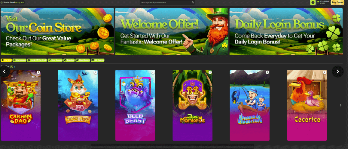 The Shamrock Club VIP program uses a horizontal progress bar and clover-themed tiers, with Loyalty Points earned as you play, but actual benefits like cashback, rakeback, or concrete coin boosts are barely explained. There is no obvious evidence of regular slot races or leaderboard tournaments, which leaves high-volume players without the extra competition and prize overlay that many rivals now treat as standard.