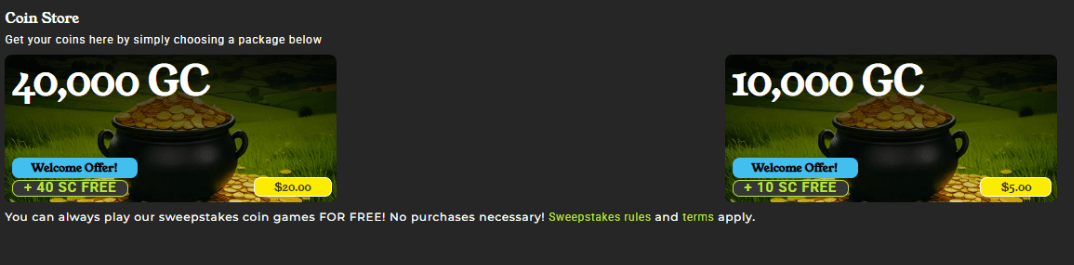 The Coin Store offers just a few tiers, such as roughly 10,000 Gold Coins plus 10 Sweeps Coins at the low end and about 40,000 Gold Coins plus 40 Sweeps Coins at a higher tier, with welcome overlays advertising extra SC on early buys. Pricing looks broadly in line with sector norms, but without aggressive first-purchase multipliers or clear âbest valueâ labels, Rainbows End does little to stand out against brands that heavily front-load value on day one.