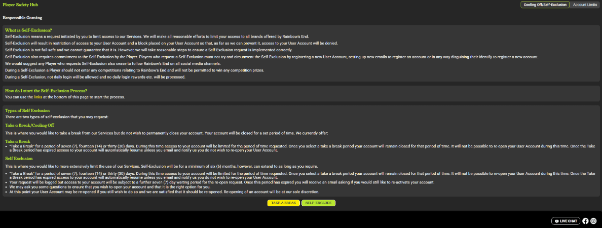The responsible gaming âPlayer Safety Hubâ is one of Rainbows Endâs strengths, enabling self-exclusion, time-limited âTake a Breakâ options, and account limits that can restrict purchases and possibly redemptions. These tools put it slightly ahead of sweeps sites that offer only email-based self-exclusion, but not yet at the level of the most advanced best-practice setups, which layer in session reminders, detailed dashboards, and instant limit changes.